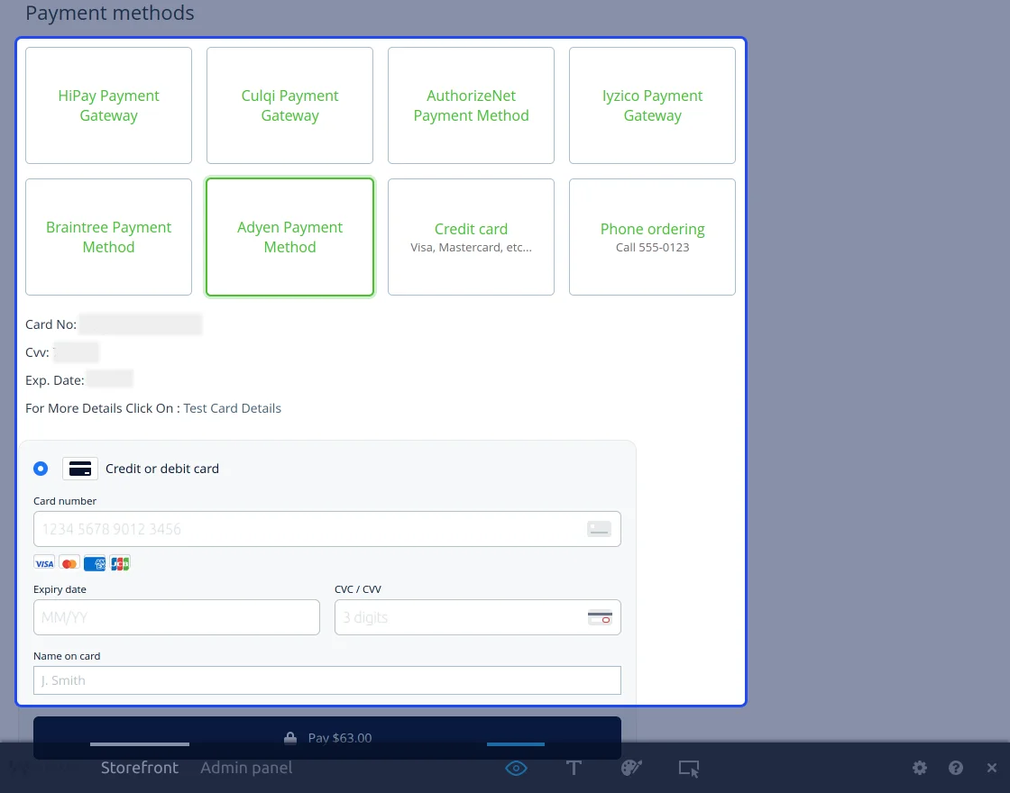 The Adyen payment plugin works with multiple cards like Visa, Mastercard, American Express, Discover, JCB, etc.