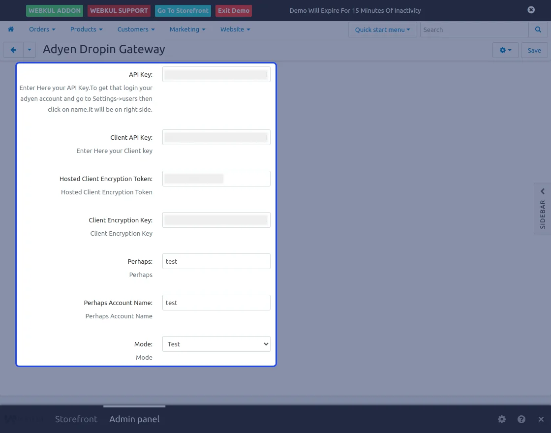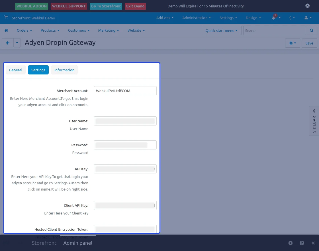 - Afterward, enter the information for the Adyen account that the Admin registered with the Adyen payment gateway.