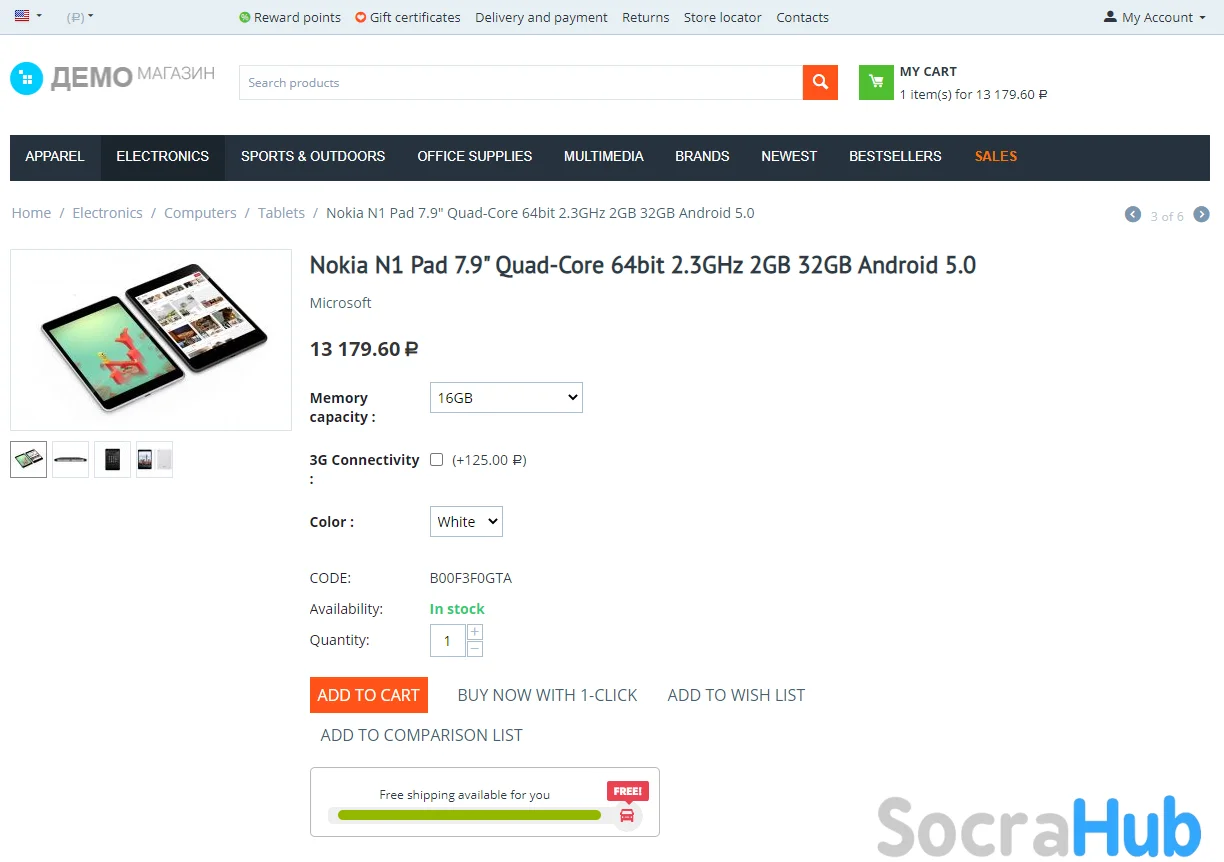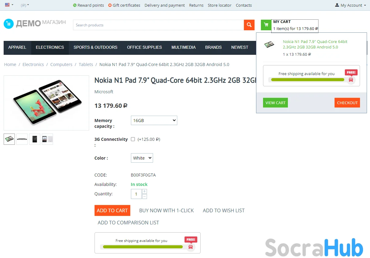 • Ability to show a special block (progress bar “left for free shipping”), which shows the amount of the cart total left to receive the "Free Shipping" bonus on the product page, in the cart, in the cart drop-down list, in the “Product added to the cart” window.