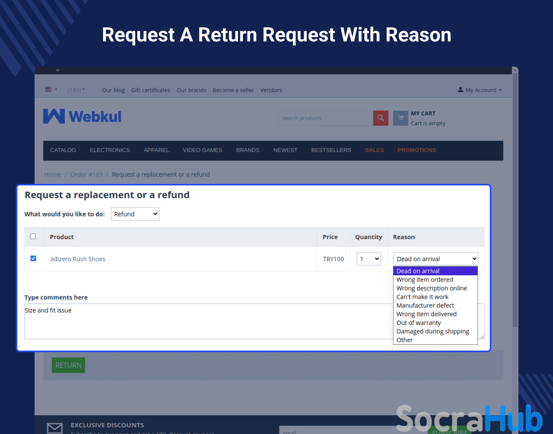 The customers can raise a request to refund or replace the ordered item by choosing the reason for the same.