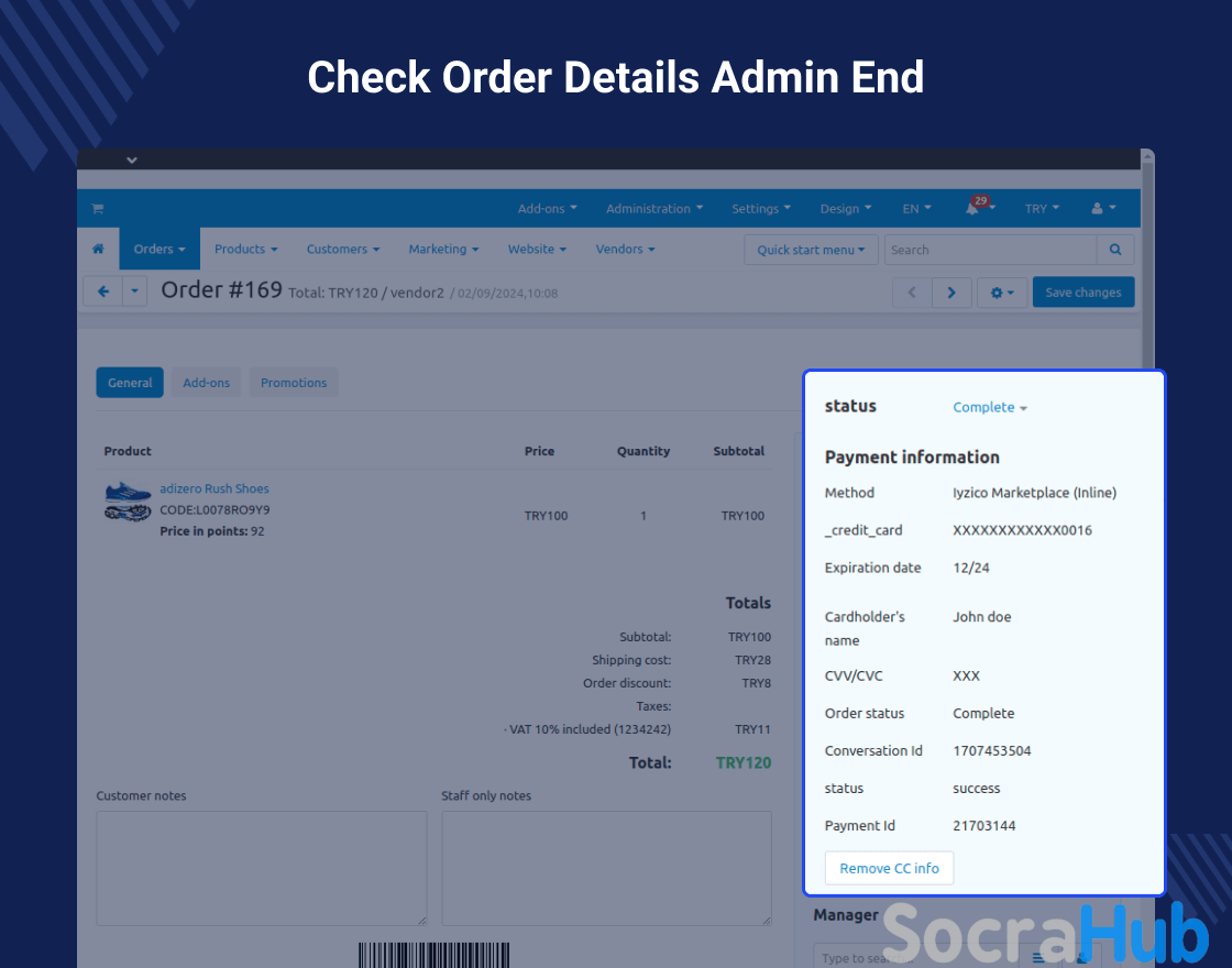CS-Cart Marketplace iyzico payment gateway helps the marketplace vendors to accept payments online by enabling the iyzico payment method for the product purchase. Customers can pay for their purchases with confidence by using the iyzico payment option during checkout because all transactions are entirely safe.