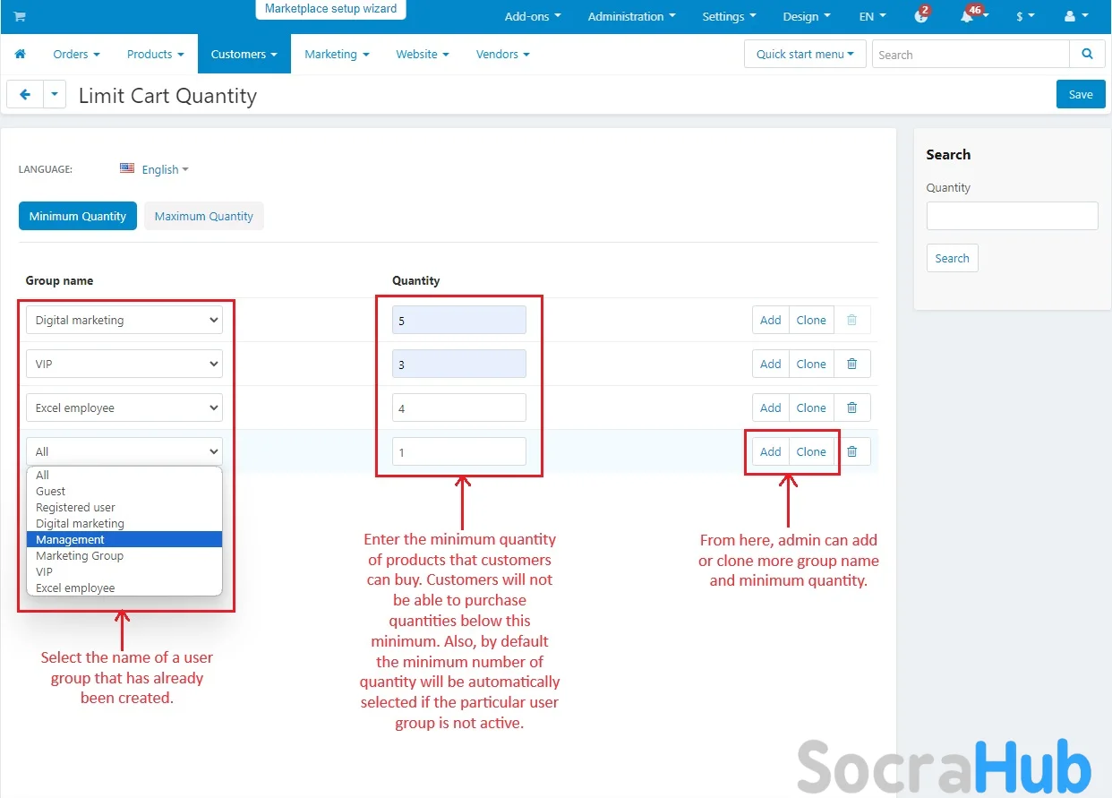 - More user groups can be added or cloned along with their respective maximum and minimum quantity conditions.