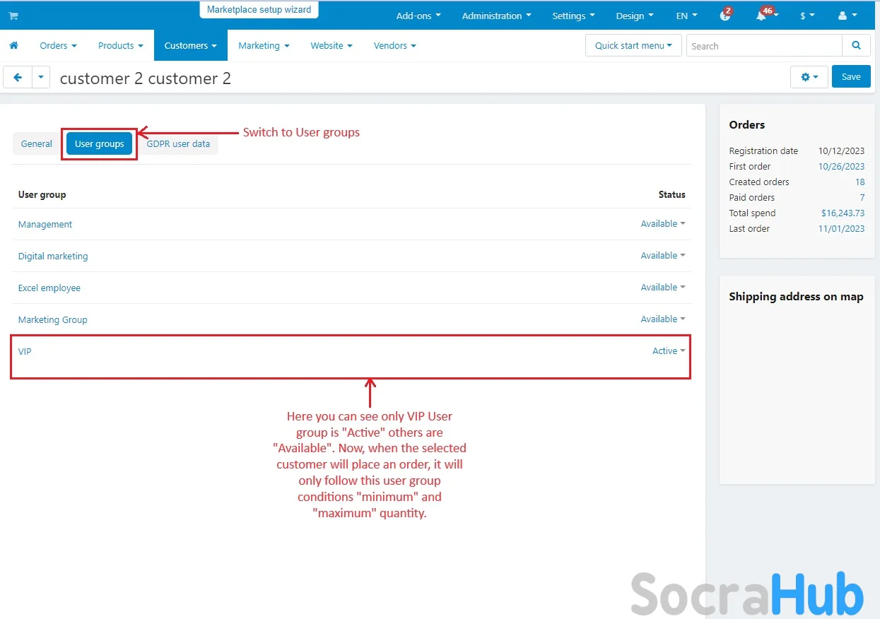 - Customize shopping rules for specific customers by activating a single user group.