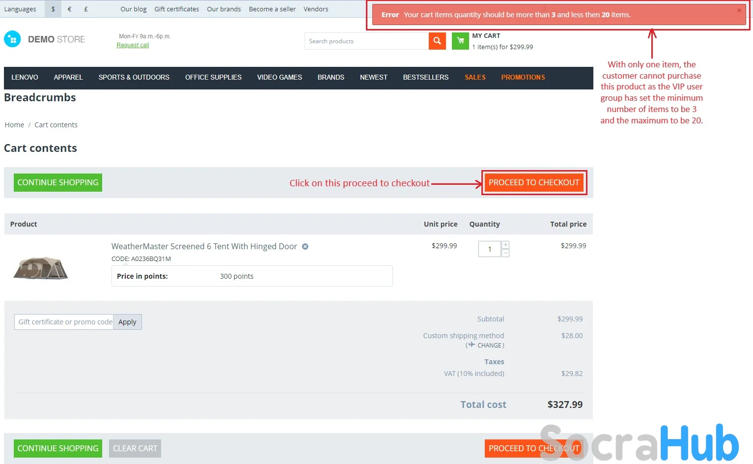 - Customers get a warning in red if they try to buy less or more than allowed items.