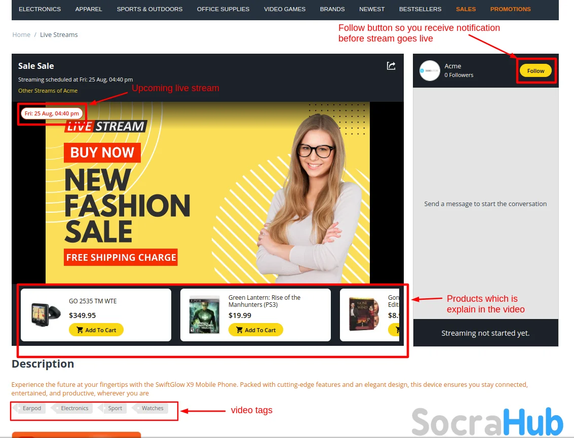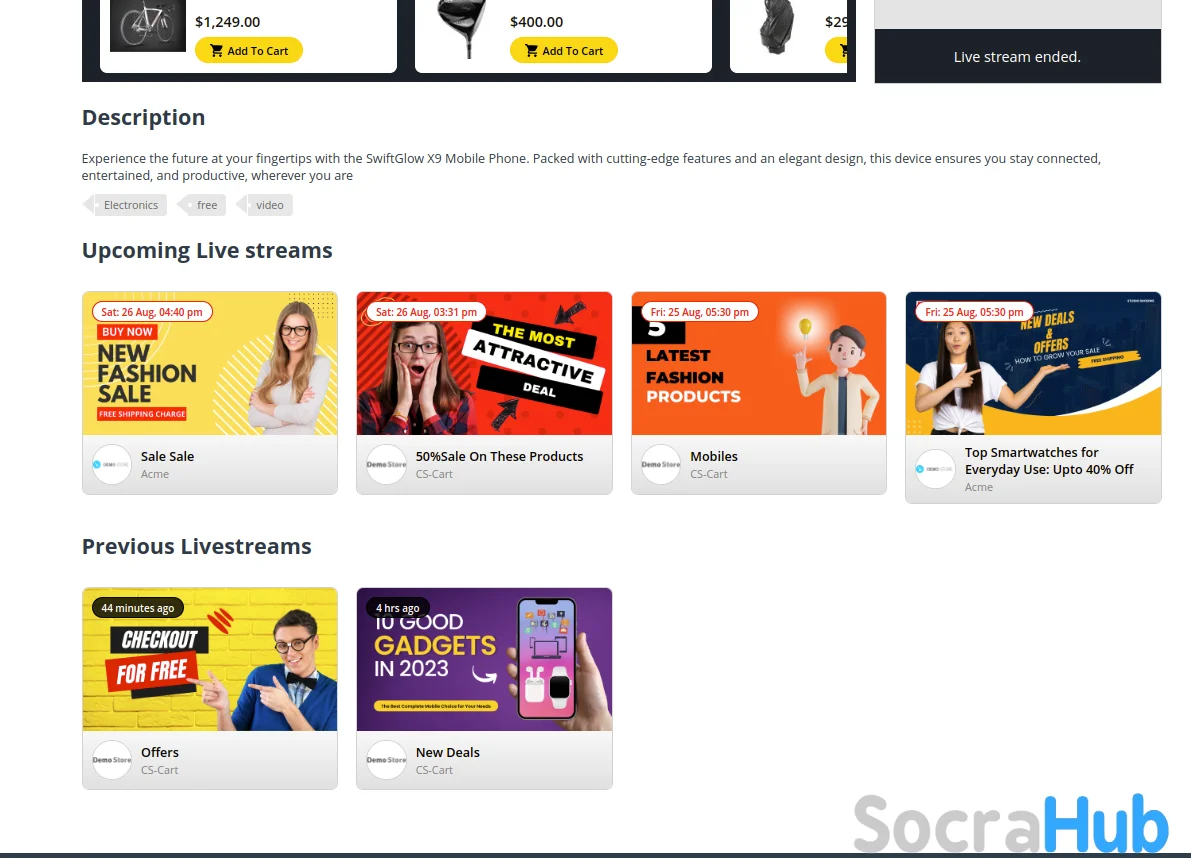 Live commerce, or social commerce, refers to a combination of e-commerce and live streaming. Our addon provides the two types of streams 1. Live YouTube video stream and 2. Pre-recorded video stream. It allows businesses to showcase their products or services in real-time through live video broadcasts, while viewers can interact with the hosts, ask questions, and make purchases directly within the streaming environment. It's essentially a fusion of entertainment, engagement, and shopping.