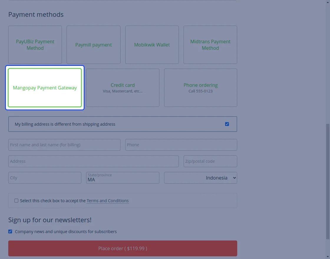 - Customers can choose the Mangopay payment, it will redirect them to the Mangopay website.