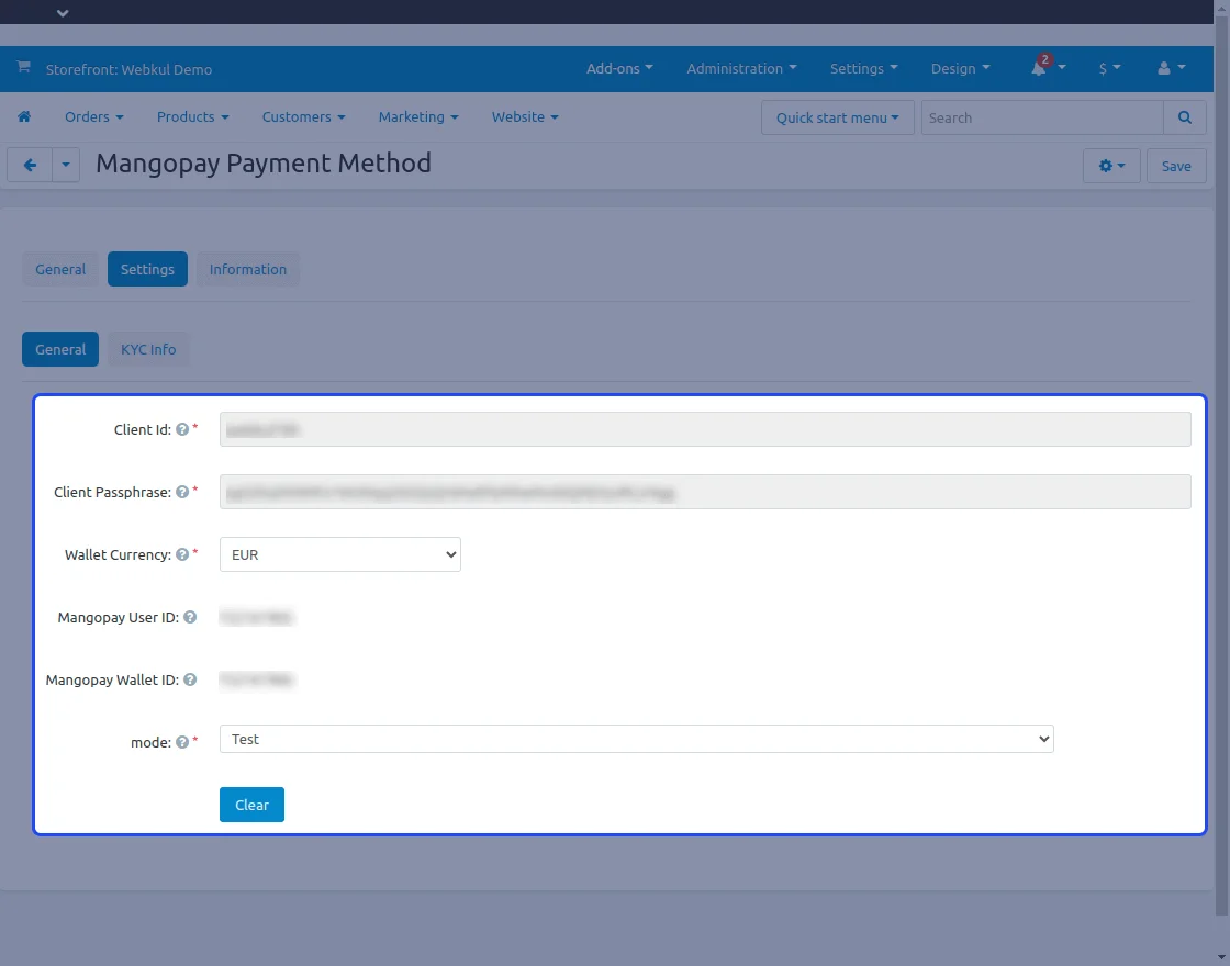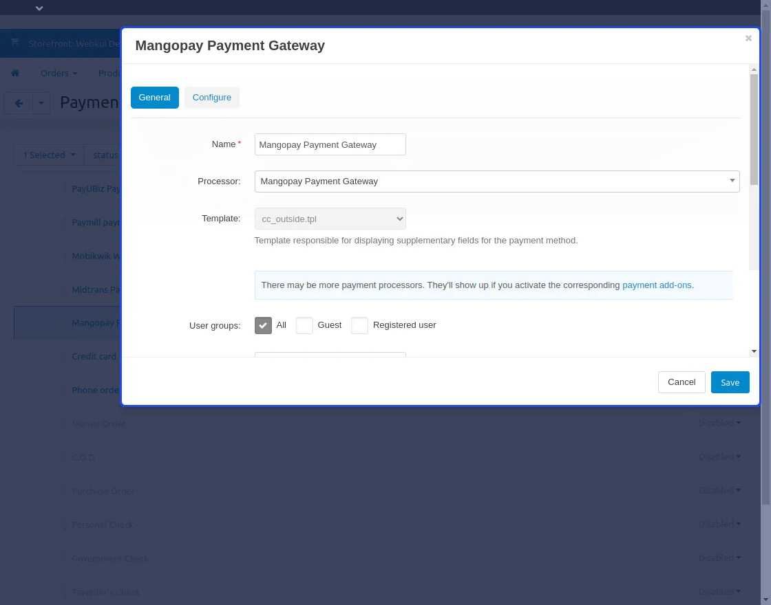 When the user purchases the CS-Cart Mangopay Payment Gateway extension, some initial configuration is required to enable the Mangopay option on the front end.
