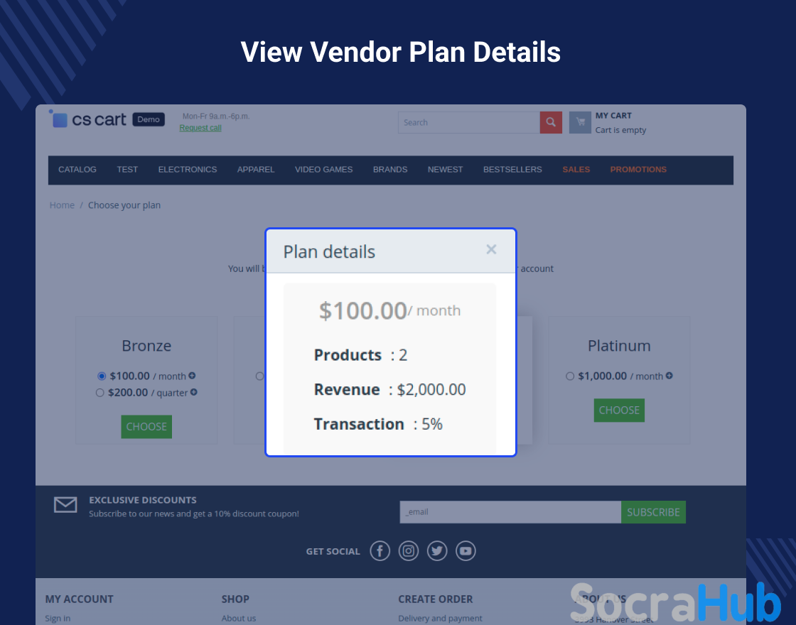 The vendor who wants to register at the CS-Cart store needs to purchase a plan with respective restrictions related to the products.