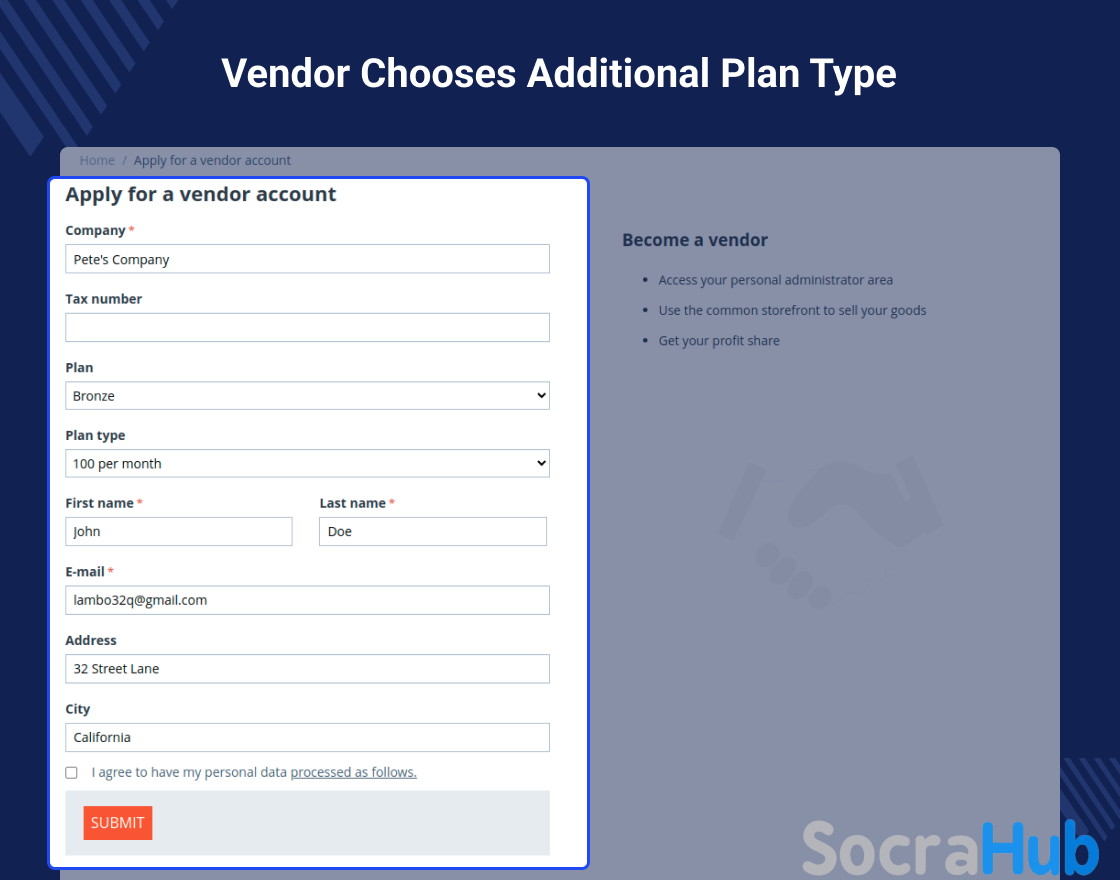 After selecting a vendor plan the vendor will be able to register at the CS-Cart store.Here, the vendor has to select the plan type that is for the commission part of the selected plan.