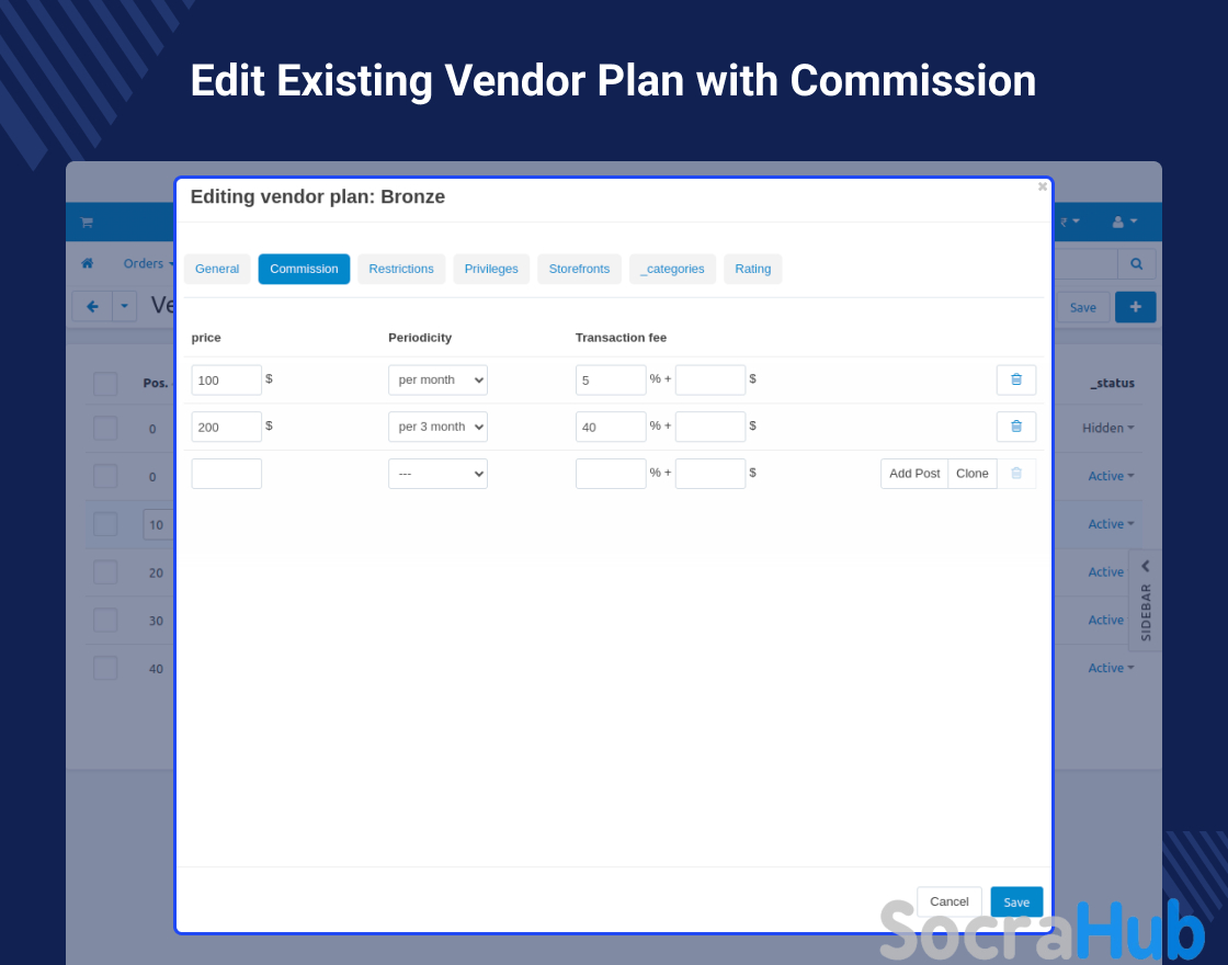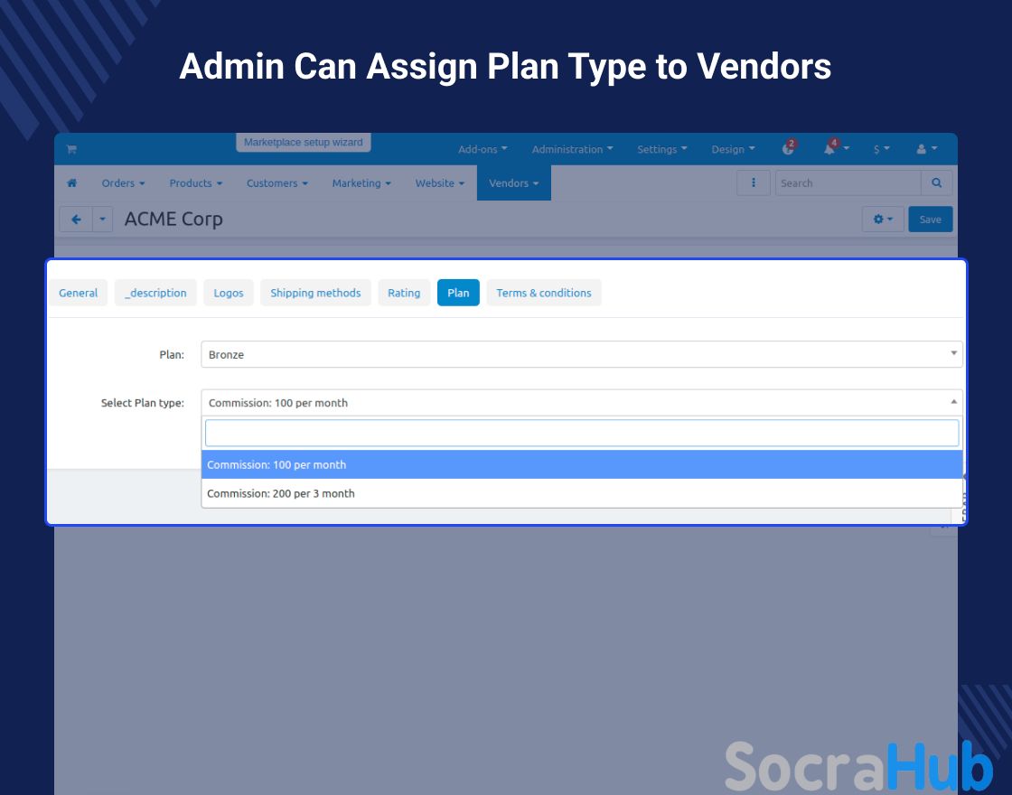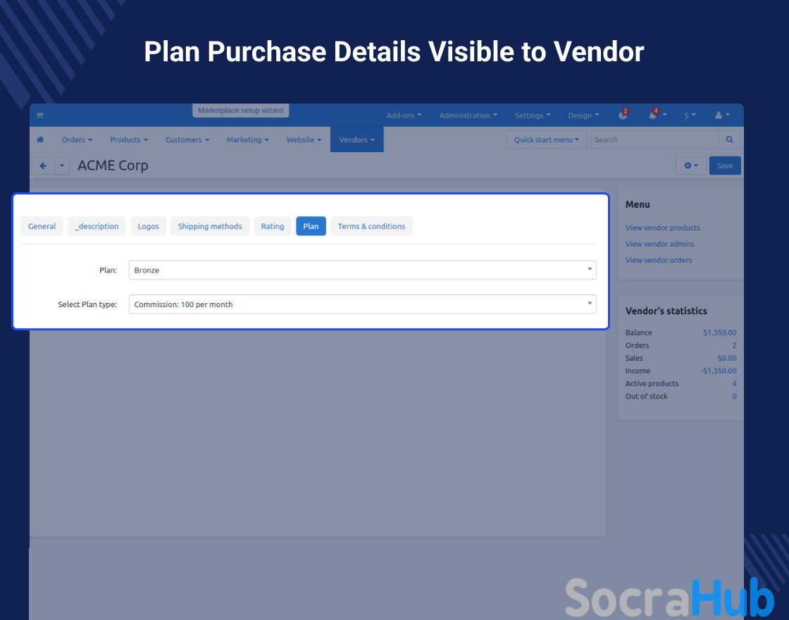 To provide vendors with multiple options of commission to a plan, a “CS-Cart Plan Modification” add-on is developed. This Add-on allows the Admin to create multiple options based on the number of products and commission as a “plan type” for a single Plan.