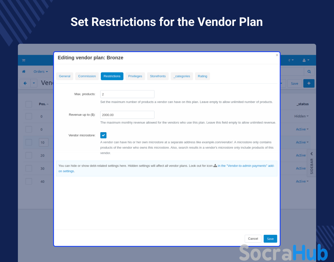 • Set the maximum number of products that a vendor can have on the plan. Choose the maximum monthly revenue allowed for a vendor. Allow the vendor to have his micro site.
