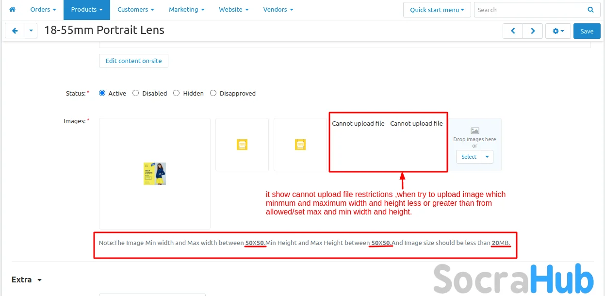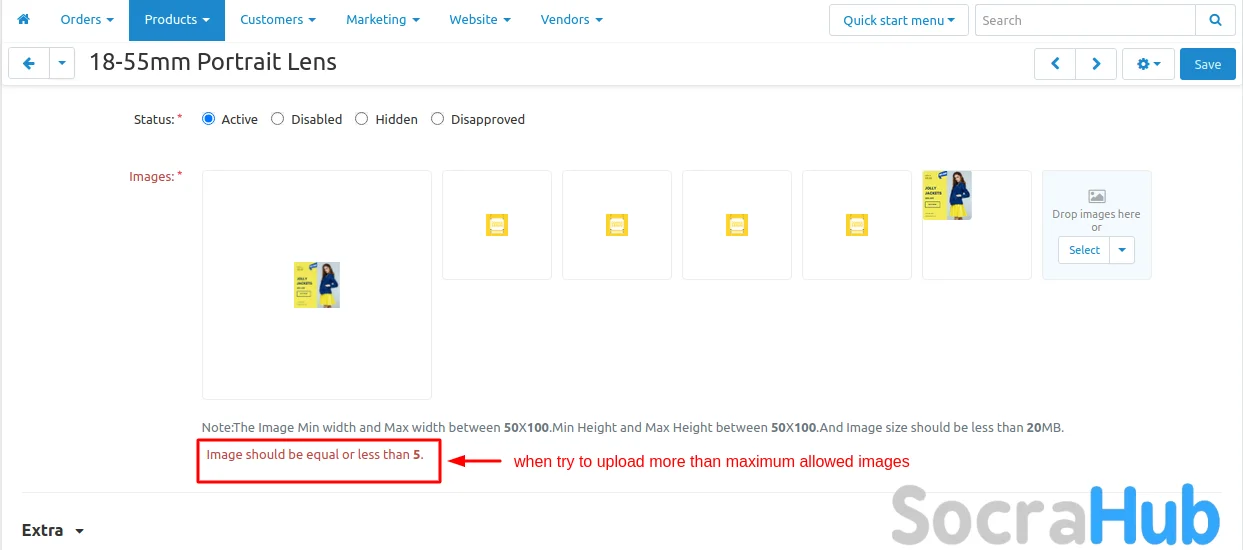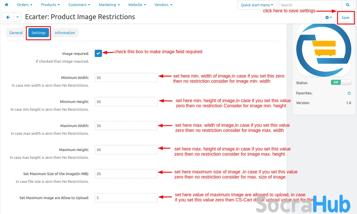 This addon also provides functionality to set minimum and maximum image width and height from addon settings. Admin can set the number of maximum allowed images to upload and the maximum size of that uploading images from the addon settings.