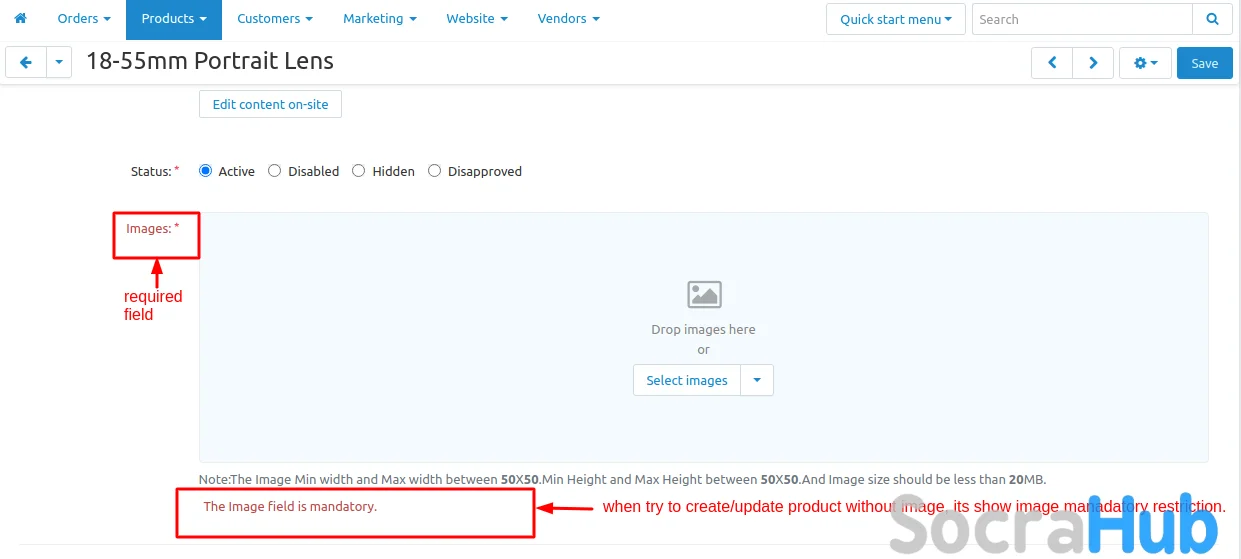 This addon allows the Admin to restrict product images during product creation or update. the addon provides functionality to make the image field a required field at the time of product creation or update.