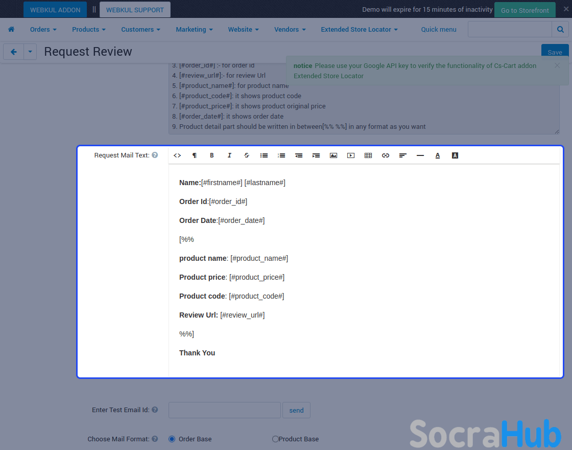 • Select the status of the order. Set the review request mail text in the template field.