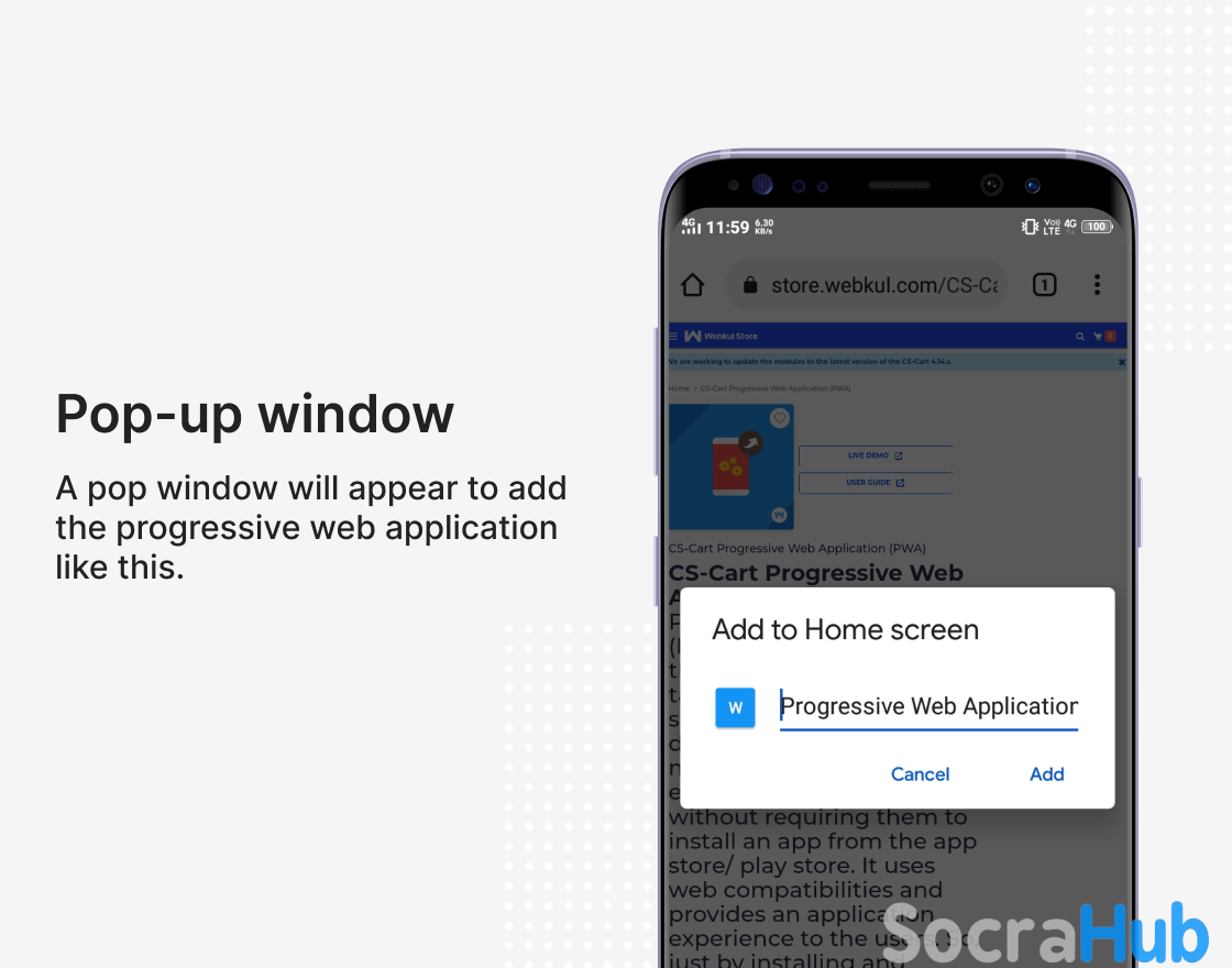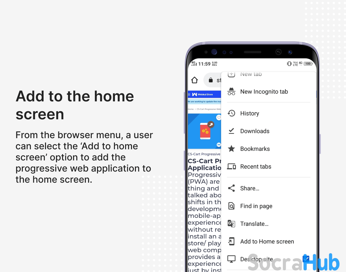 PWAs are the ideal answer for merchants looking to increase engagement and revenue. With this add-on you allow people to add their website to their home screen from their mobile browser. It behaves and feels like an application after being added.
