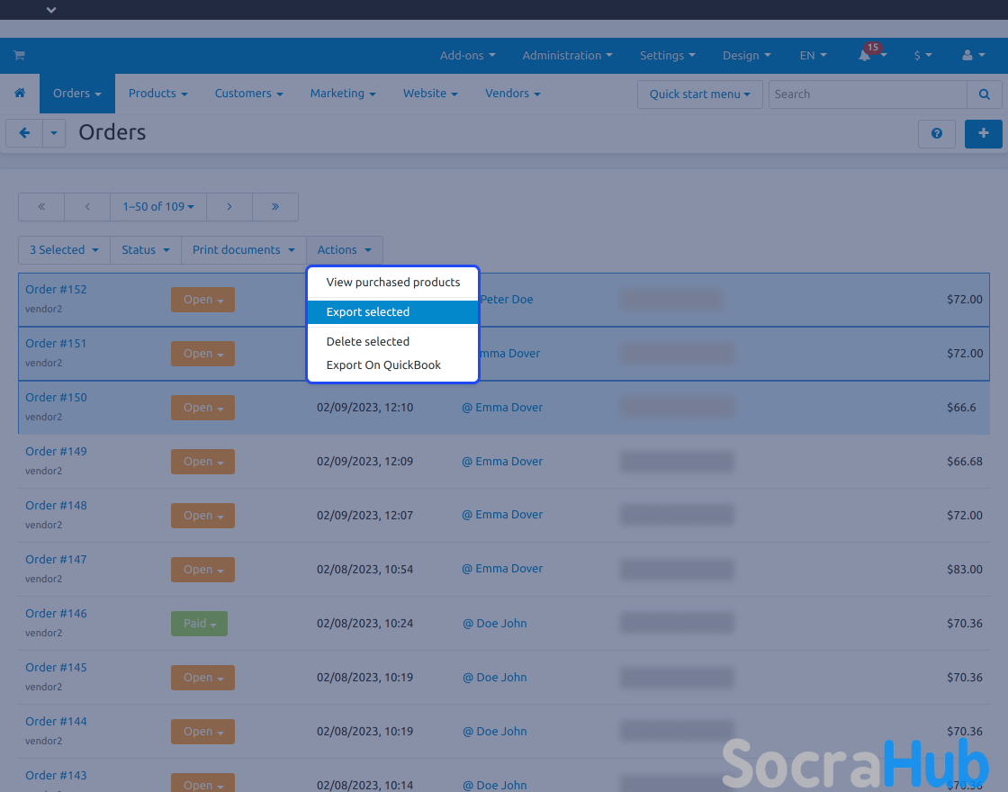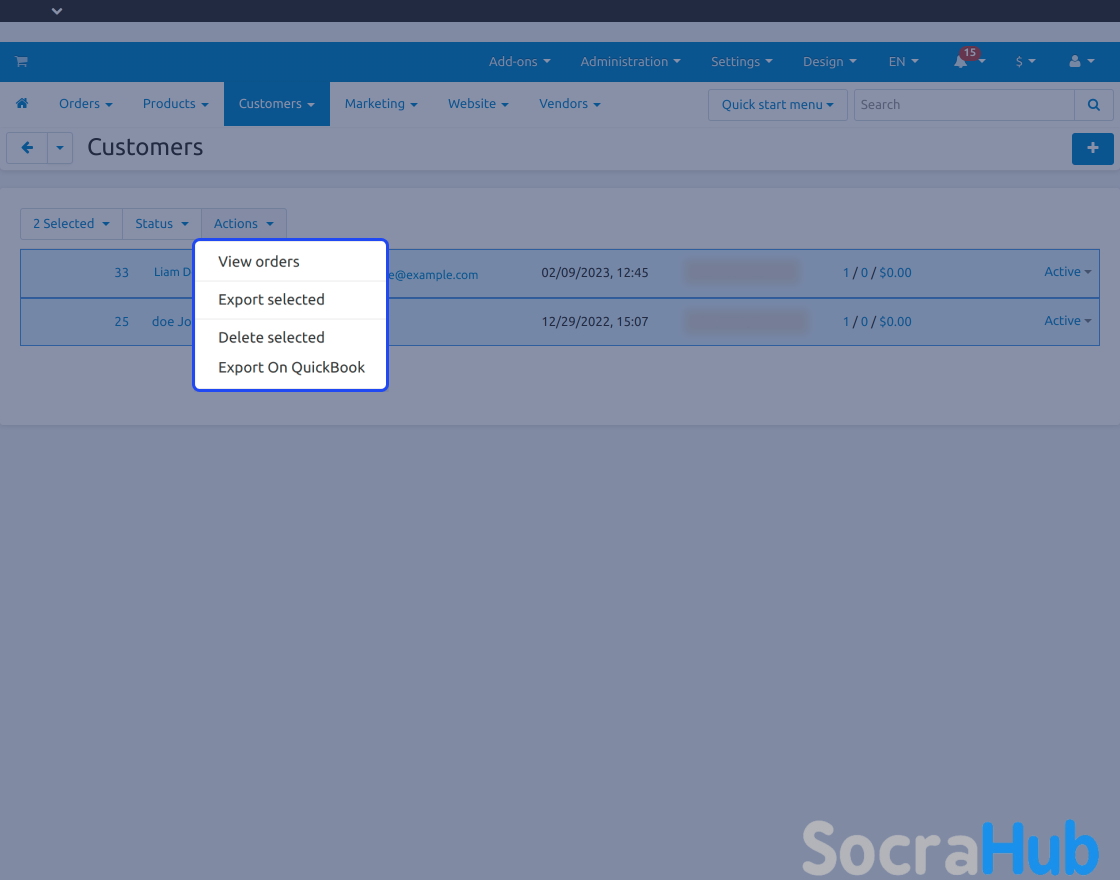 - Similarly, on the CS-Cart store, open the customer section, select customers, and export them singly or in bulk mode.