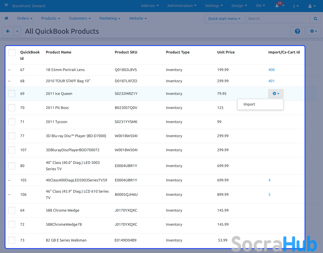 - The Admin or seller can import or export one or more products from the QuickBooks store to the CS-Cart store and vice versa.
