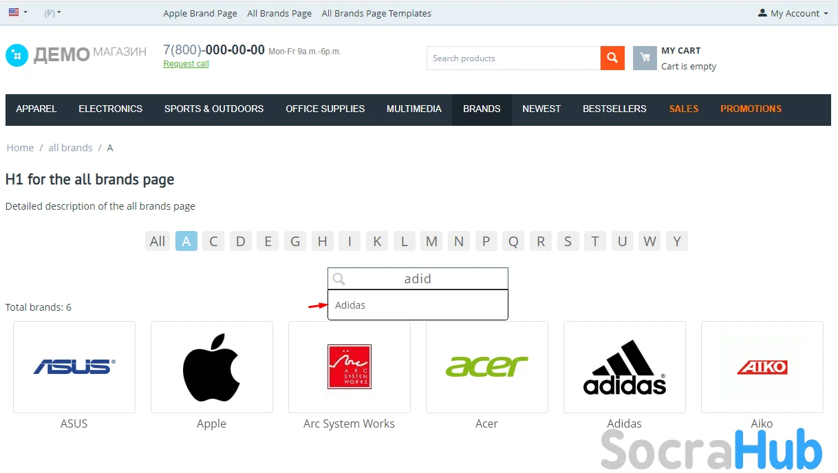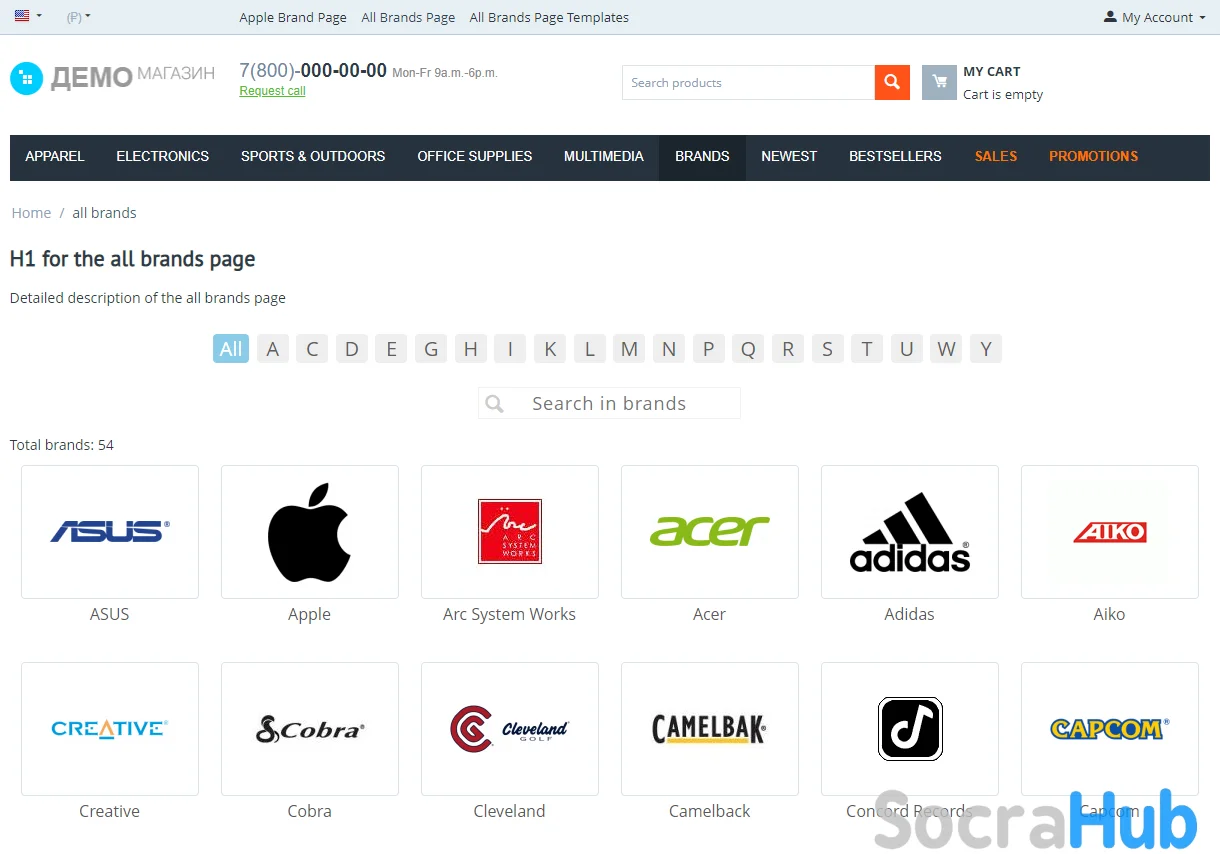 3 view templates for the all brands page, an alphabetical index and a search field, the ability to hide brands without products, and set the number of symbols to start a search - all this will make the standard all brands page more convenient and functional.