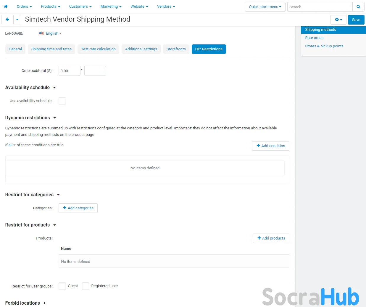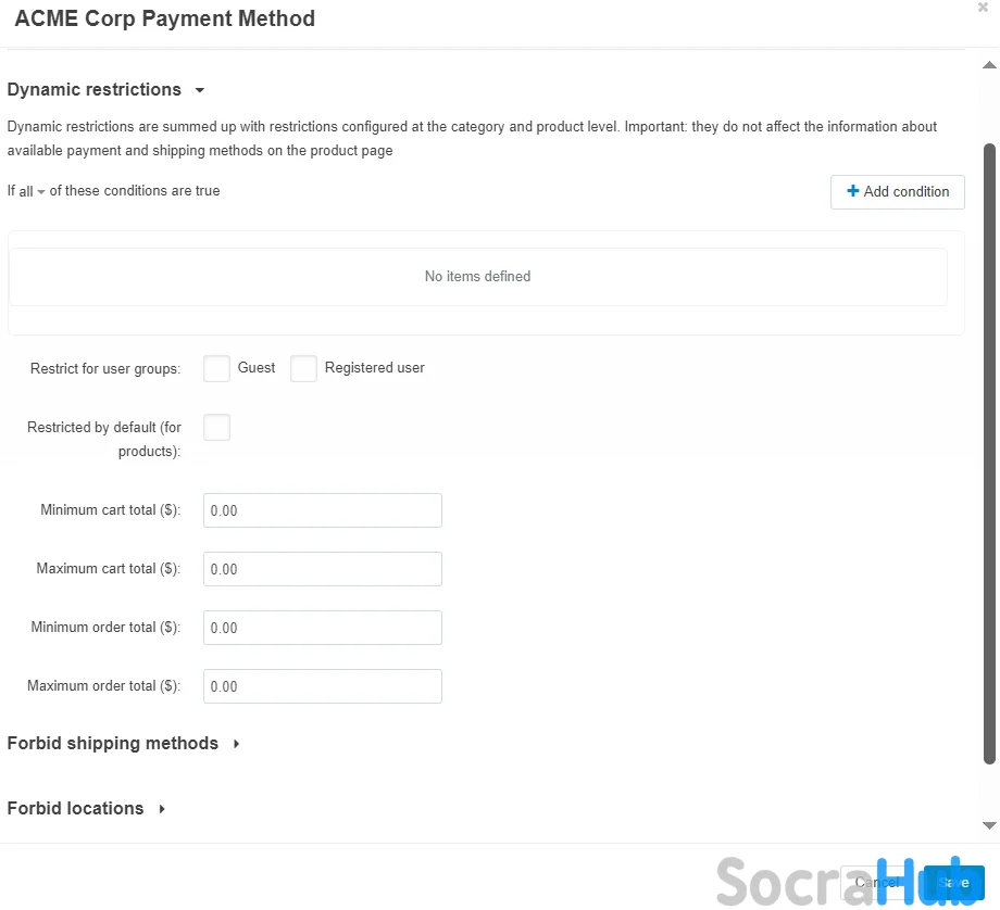 - Need more flexible restriction settings? For example, you need to find certain products to set shipping or payment restrictionsion in their settings. These products are located in different categories and you will spend a lot of time searching for them. Take advantage of dynamic restrictions in Payment and Shipping methods. These restrictions will be added to the general restrictions, but will not affect the information about available payment and shipping methods on the product page.