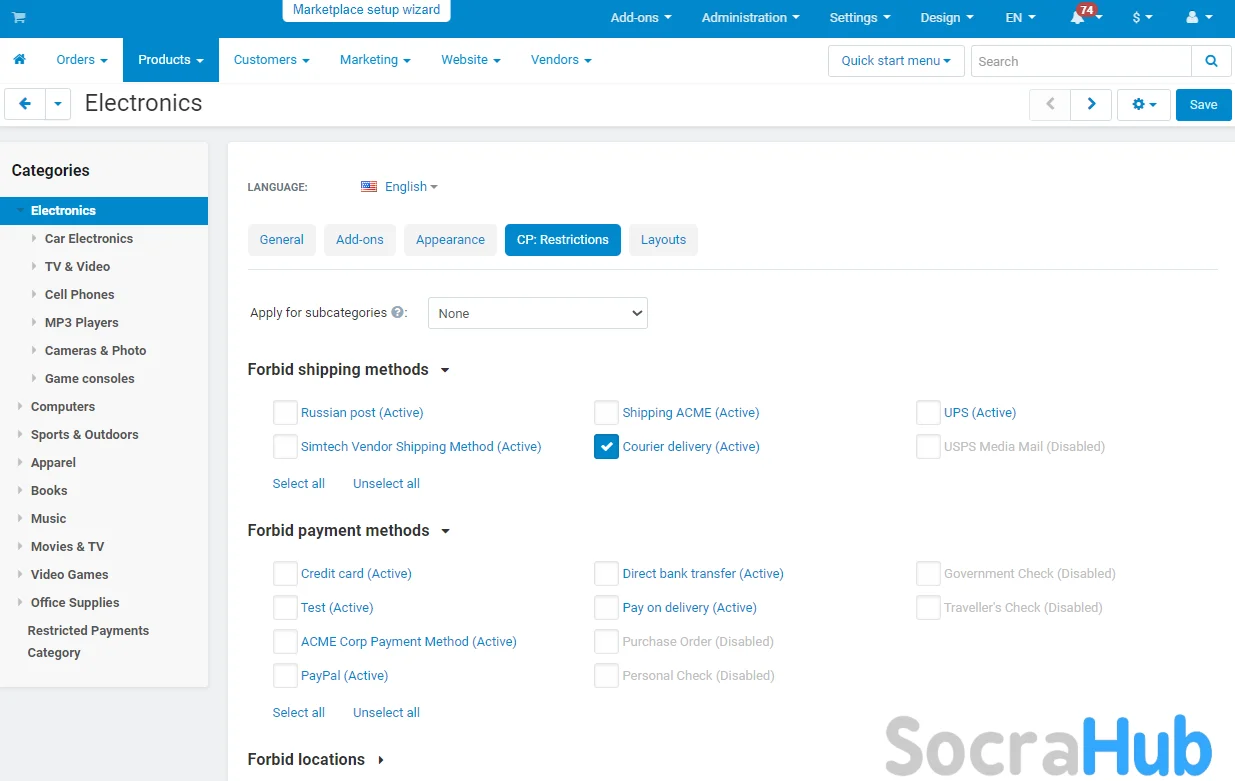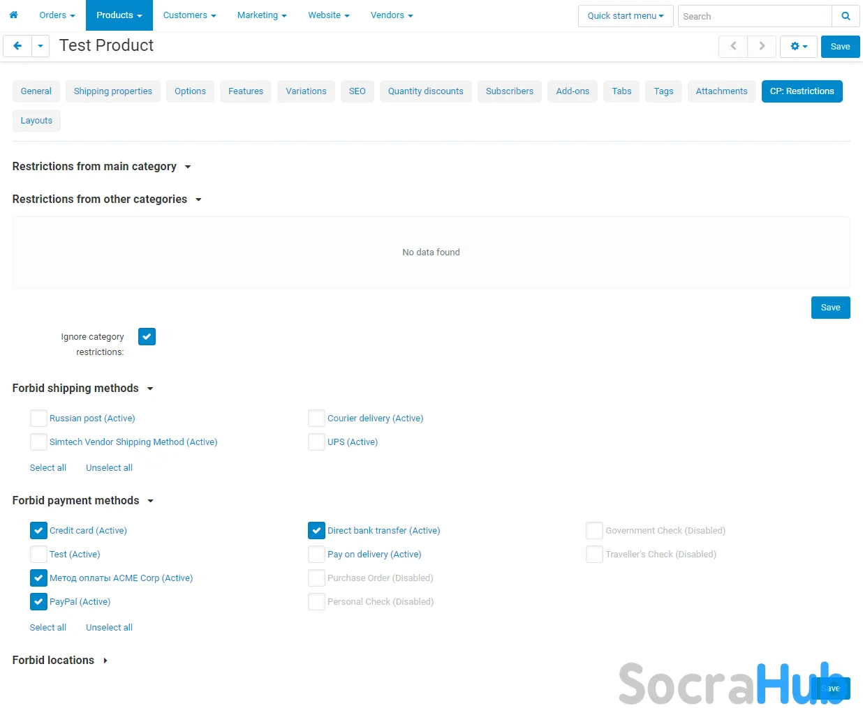 - Shipping and Payments Restrictions for a specific product with the ability to ignore the restrictions of its category.