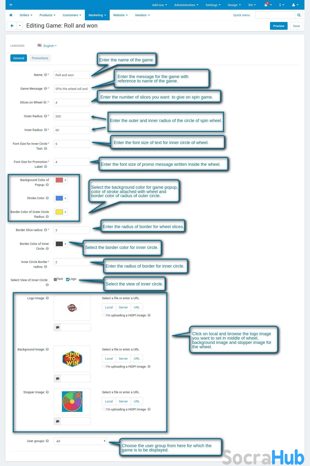 - Admin can manage the complete view of created spin game like color of wheel, logo, background image, stroke color, radius of logo, message to be displayed for each winning promotion, label name of promotion on wheel, font size of label, font size of text of inner wheel, radius of inner wheel, etc.