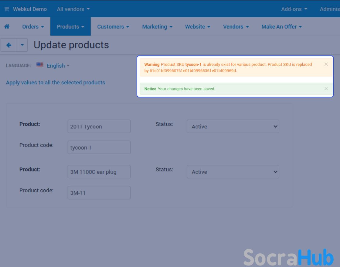 If a similar SKU code is provided to any product, a warning notification will be displayed and the product SKU for one of the products will be replaced by a new automatic generated product SKU.