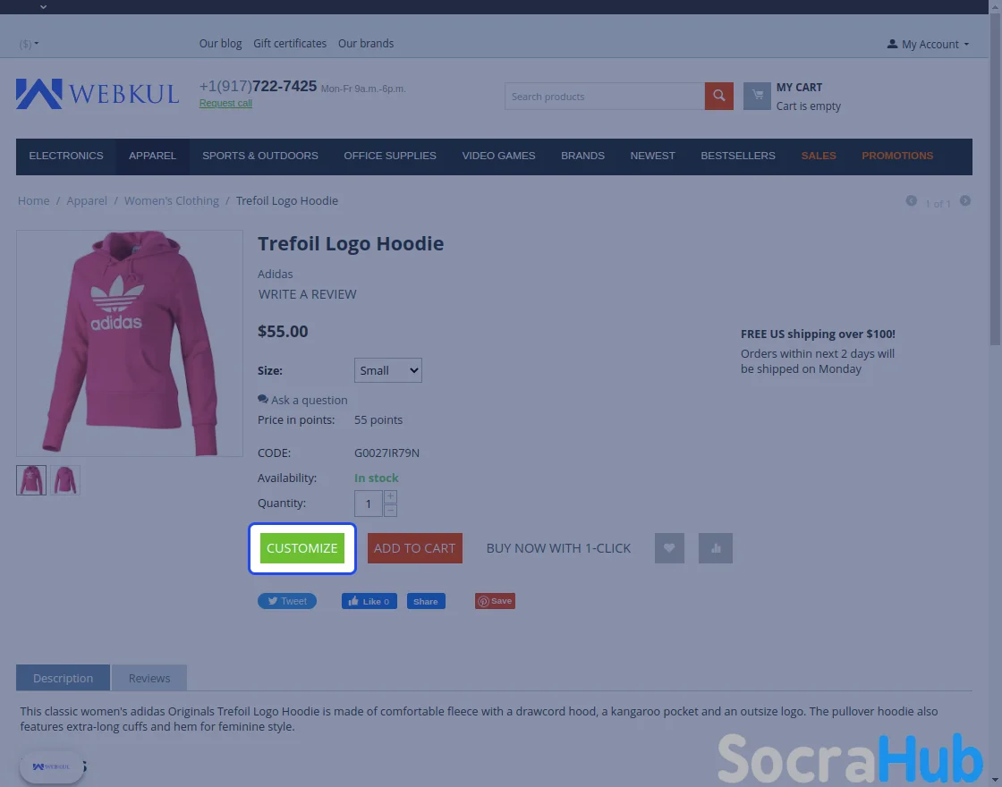 Customers can find the "customize Product" button on the product page right next to the "Add to Cart" button. Click the ‘customize Product’ button to make modifications to the product. It brings up the canvas editor for customizing the product as required.