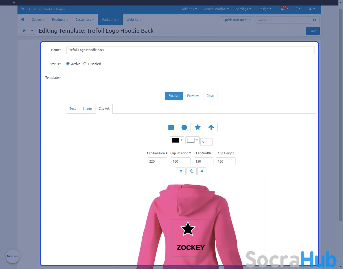 The Admin can create multiple templates for the product such as t-shirts may have a front view and a back view. The administrator can make any changes they want to the template using the text editor, graphics, and shapes.