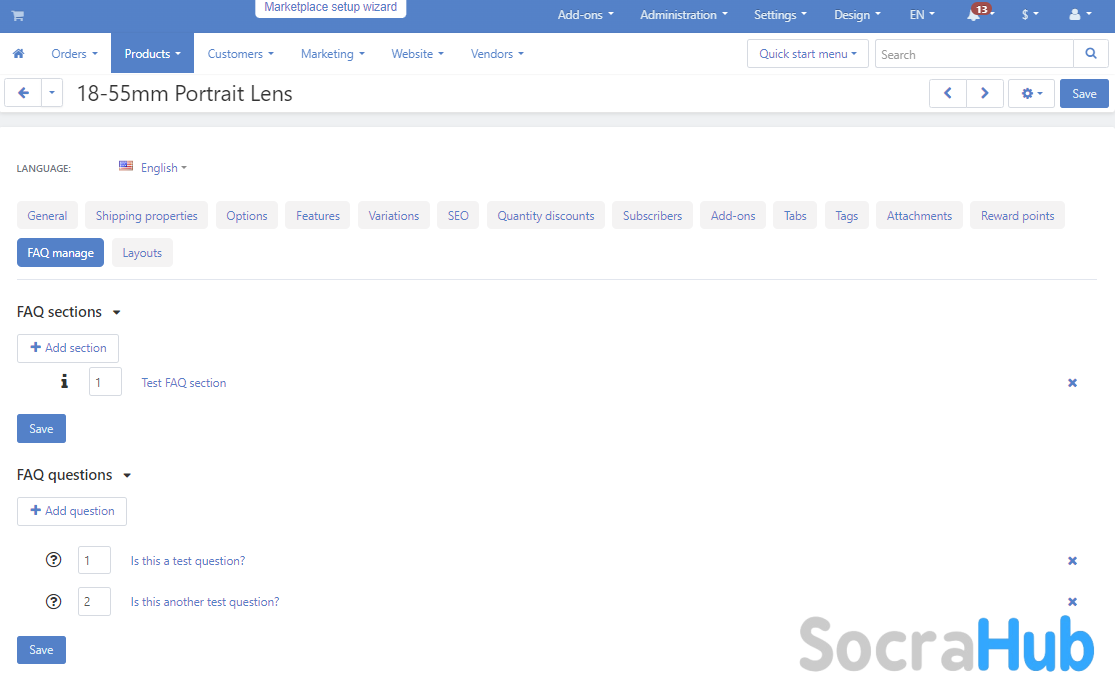 - Ability to create new or select existing questions and sections for FAQ on the product page.
