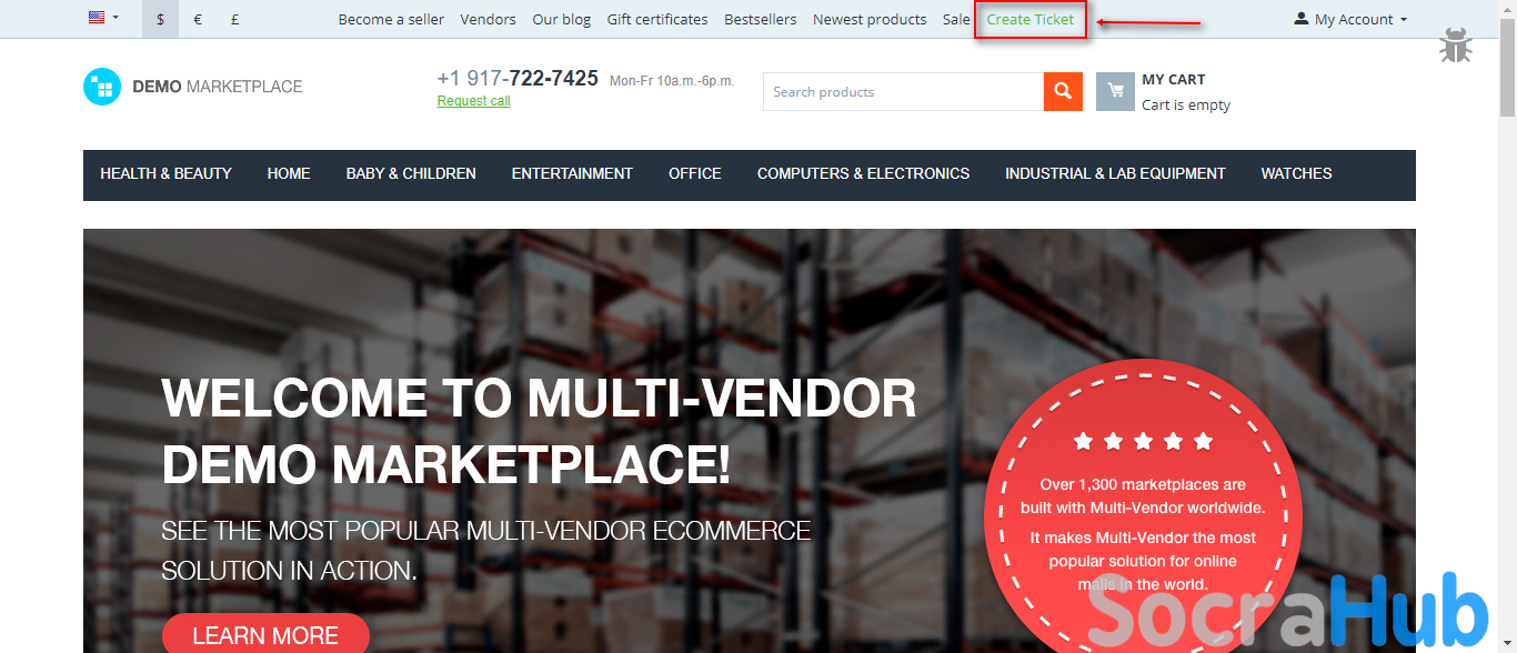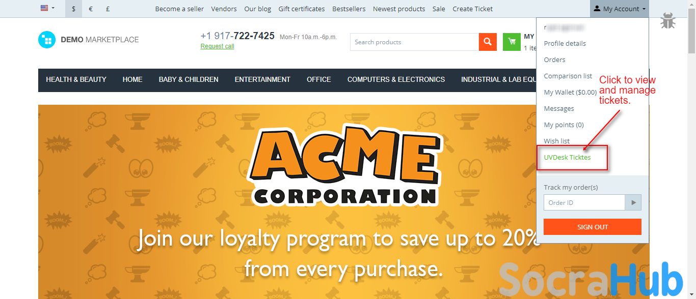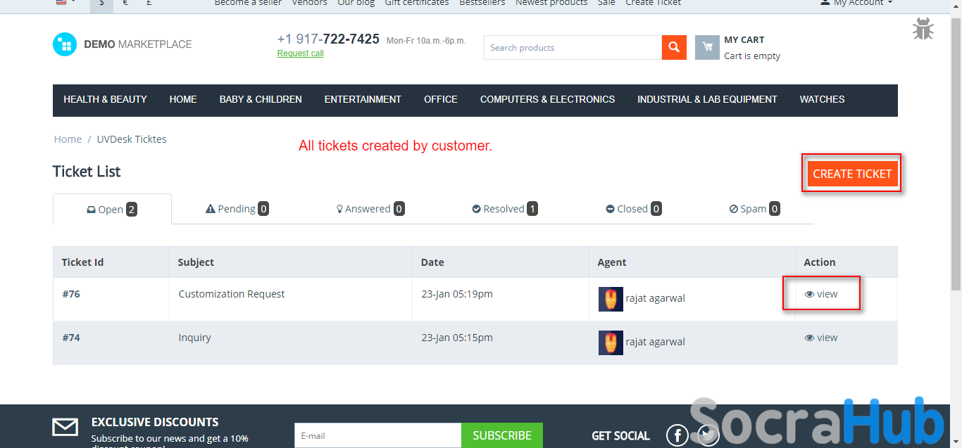 The store visitor or registered customer can find an option “Create Ticket” on the store. The customers can view their UVDesk Tickets under the My Account Section and all the tickets will be visible to the customer.- Customers can create a ticket for any help.