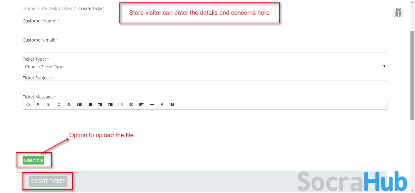 - Store visitors or registered users can raise tickets relating to any concern/issue/ inquiry.