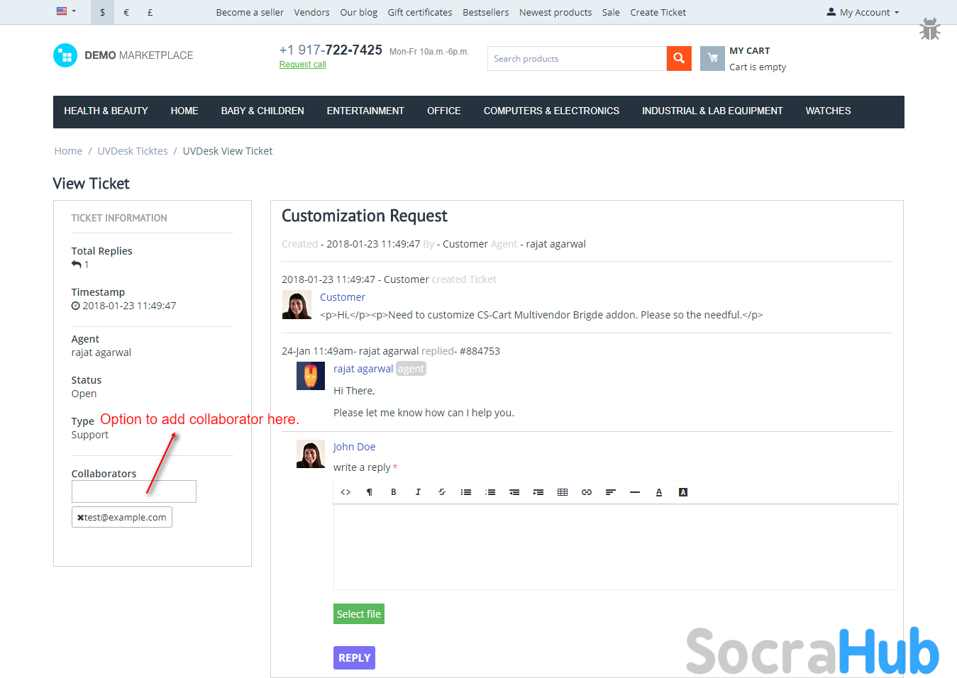 UVDesk - CS-Cart Free Helpdesk Ticket System integrates UVDesk, enabling users to create tickets directly on their CS-Cart store and allowing easy ticket management for both customers and admins.