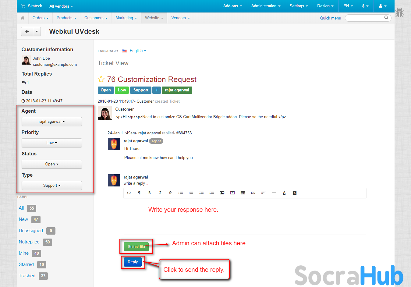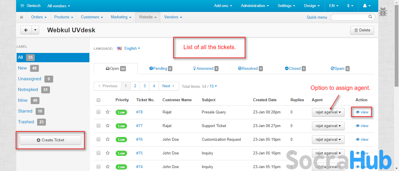- Ticket Assignments and replies can be done from UVdesk Dashboard as well.