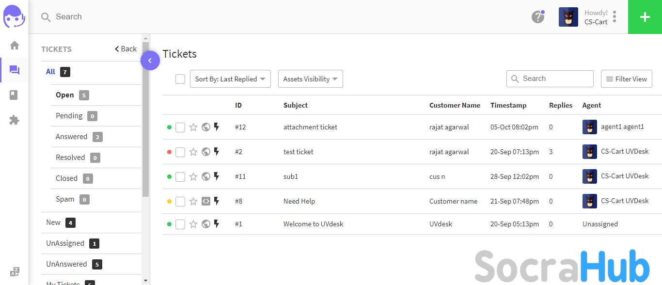 All the tickets are synced from CS-Cart to UVdesk automatically. So, once a customer creates a ticket on the store, it will be visible on the UVdesk Dashboard also. To view the tickets on UVdesk, login to your UVdesk account and navigate to the Tickets section.- Manage tickets from the UVdesk dashboard.