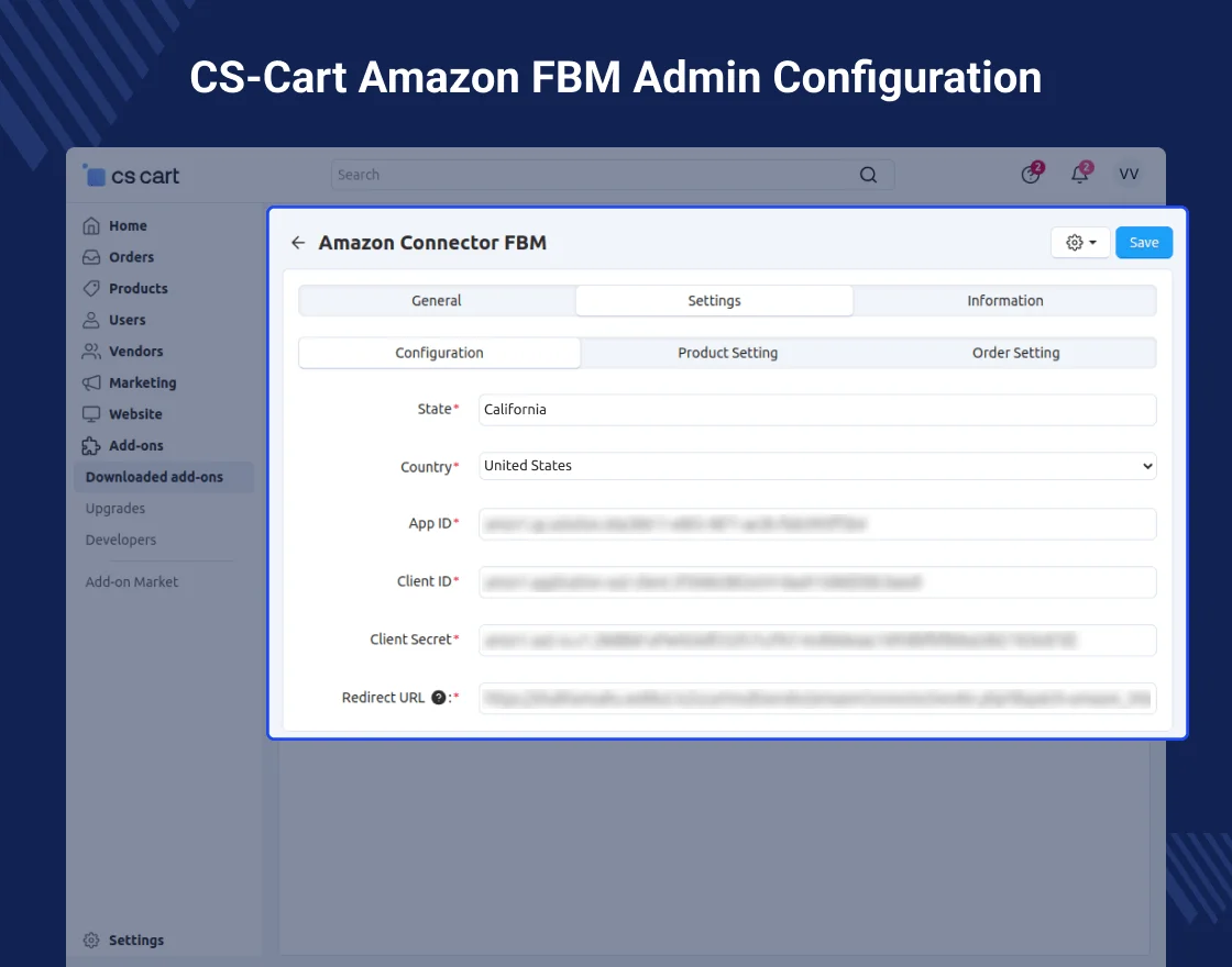 CS-Cart Amazon FBM is a connector that helps vendors connect their CS-Cart store with Amazon and manage Amazon orders directly from their CS-Cart Store.