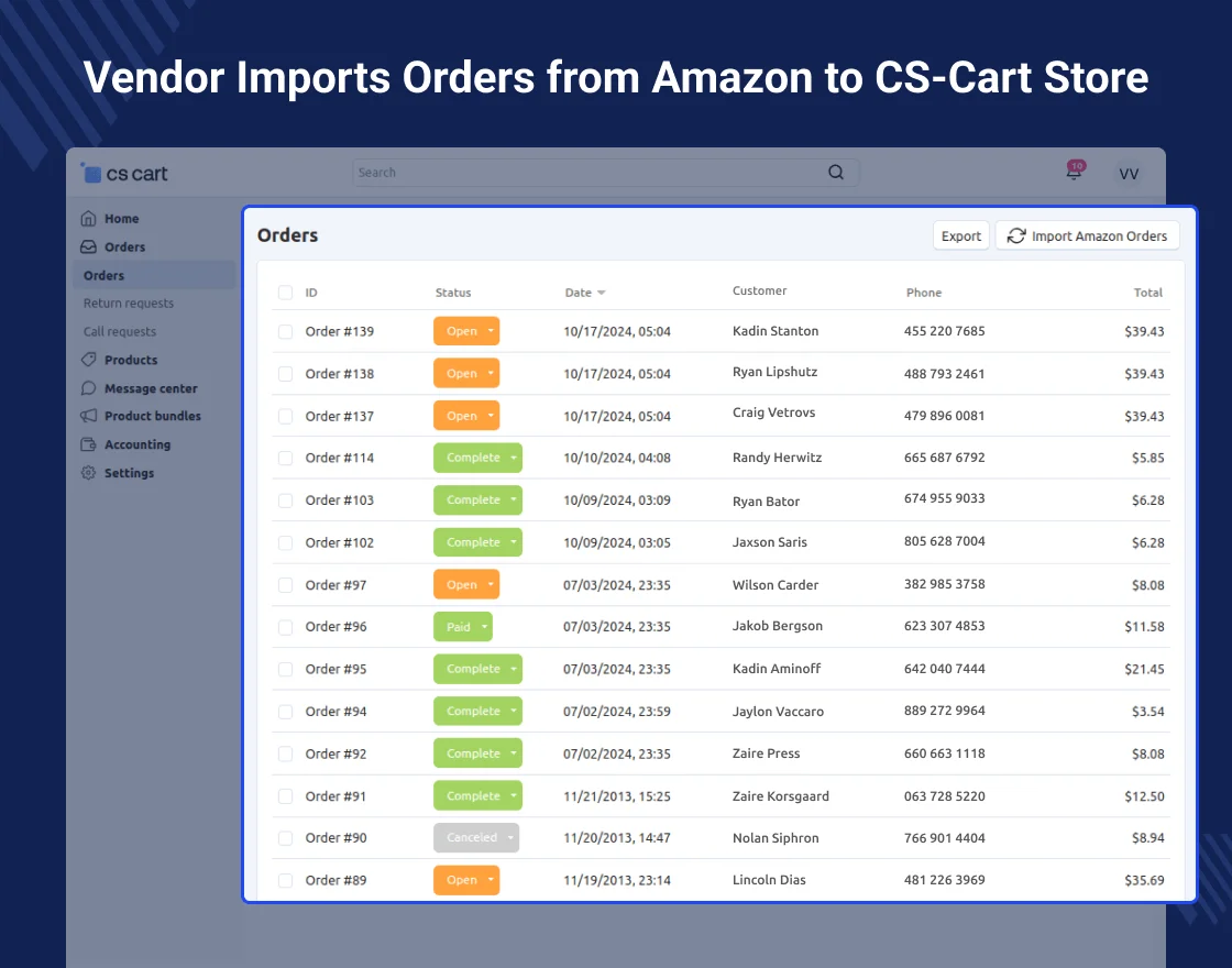 Vendors can import all the orders from Amazon to its CS-Cart store.