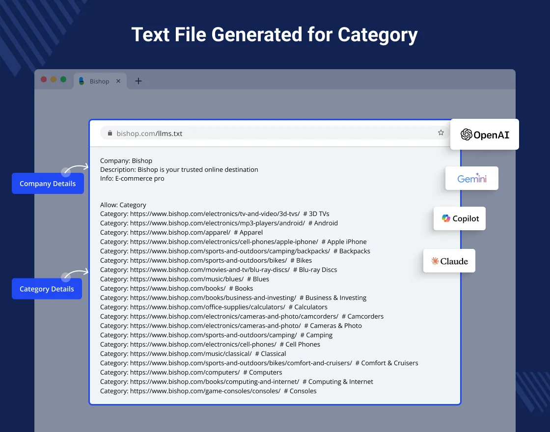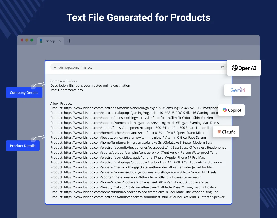 Generate a structured text file that makes your store AI-friendly and keeps data up-to-date.