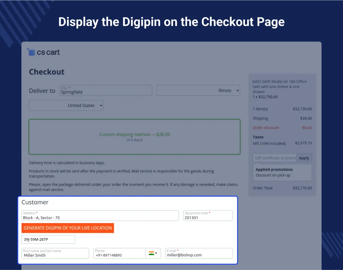 CS-Cart DigiPin Add-on helps store owners and vendors improve delivery and stop address fraud. It creates a secure DigiPin using the customer’s live location at checkout. This unique code makes order tracking and verification simple and reliable.