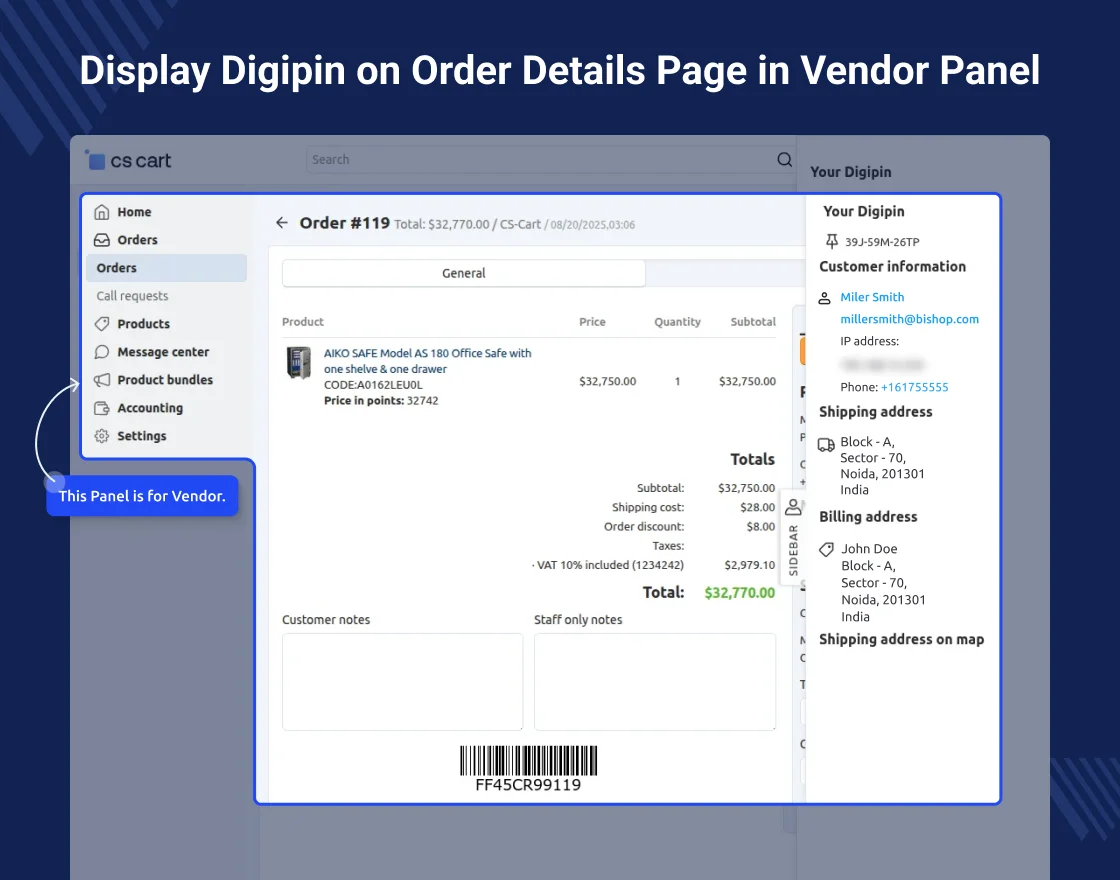 CS-Cart DigiPin Addon keeps checkout safe by generating a unique DigiPin from the customer’s live location. This code is saved automatically with every order and shown to admins and vendors on the order page.