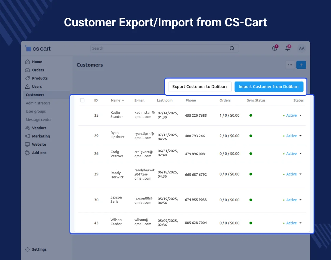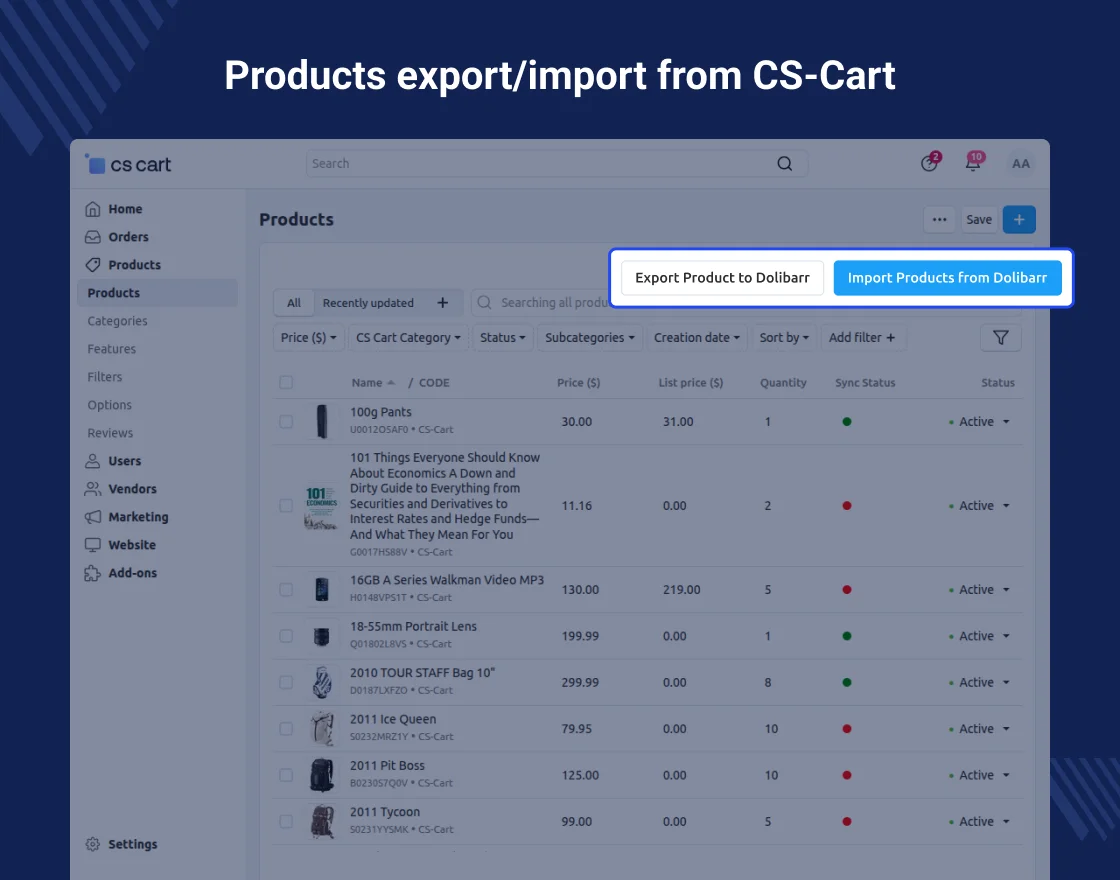 - Export/import products, customers, and orders between CS-Cart and Dolibarr.