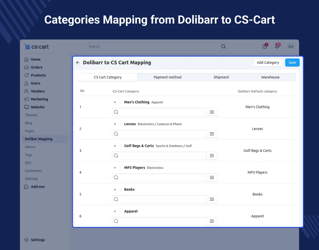 Connect categories in CS-Cart and Dolibarr for better product control.