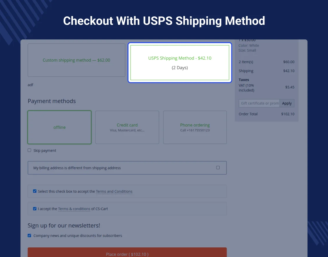 It also supports various USPS services to give your customers flexible delivery options.CS-Cart USPS Shipping Add-on is a cost-effective shipping solution that calculates price according to the size, weight, and distance.