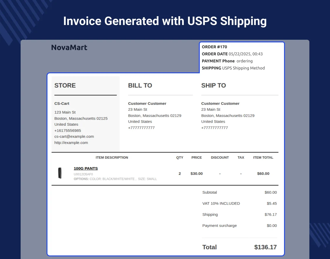 USPS Shipping Add-on for CS-Cart empowers store owners and sellers to integrate USPS services seamlessly into their store. It automates USPS shipping rate calculation and allows full control over pickup operations, ensuring smooth and timely deliveries for domestic USPS orders.