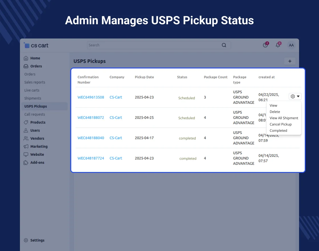 The Admin can efficiently manage USPS Pickup statuses directly from the CS-Cart backend by clicking on the settings icon.