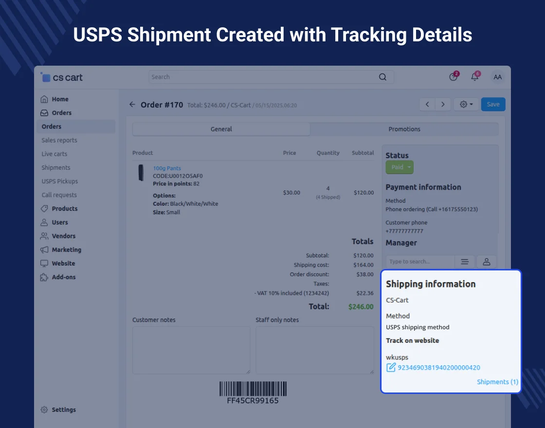 All of these features can be managed directly from the CS-Cart backend, streamlining the order fulfillment process and improving the accuracy and efficiency of shipping operations.