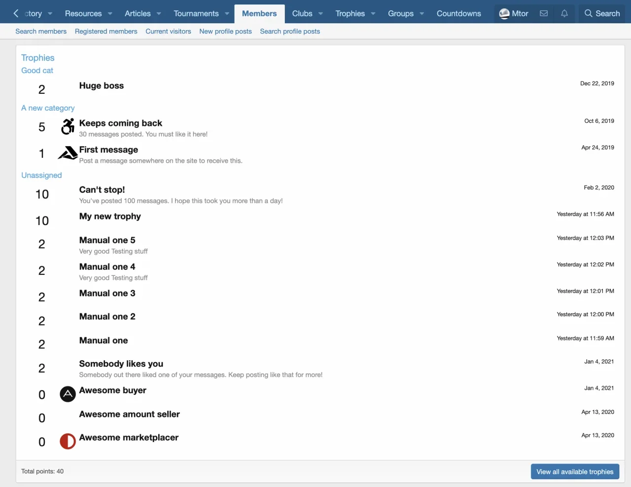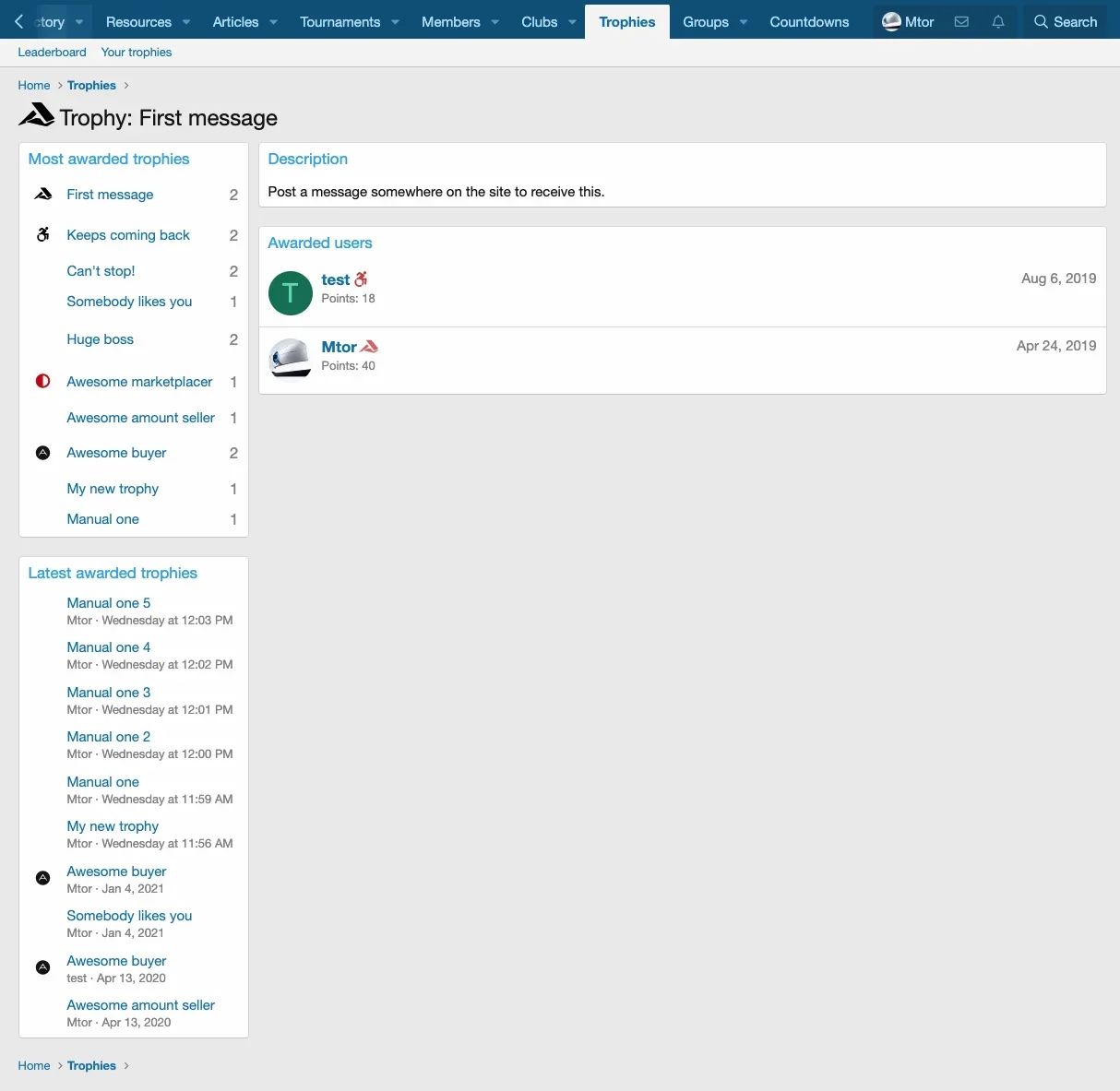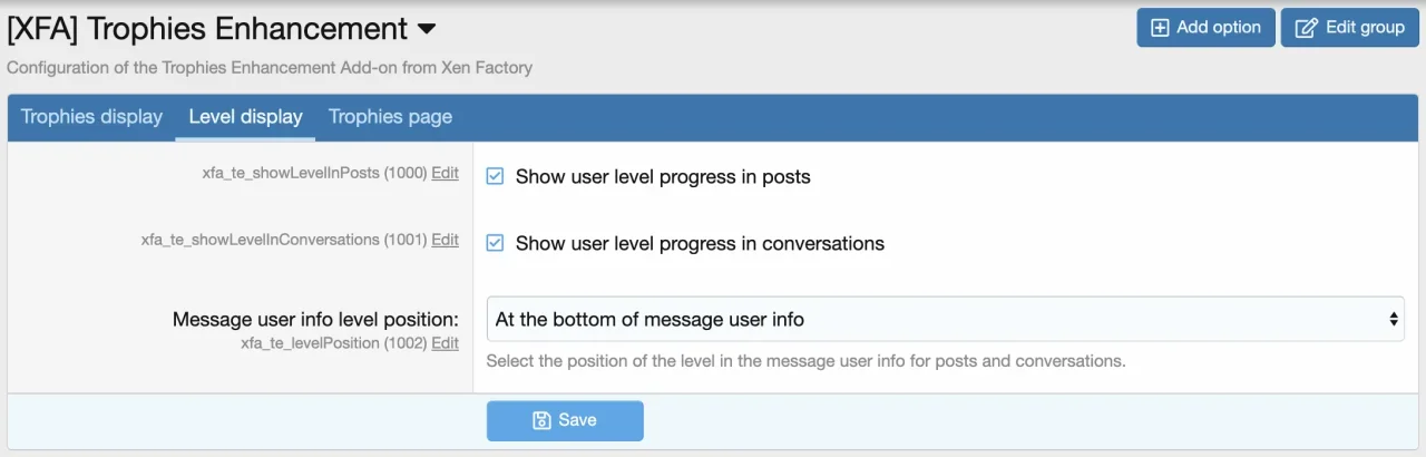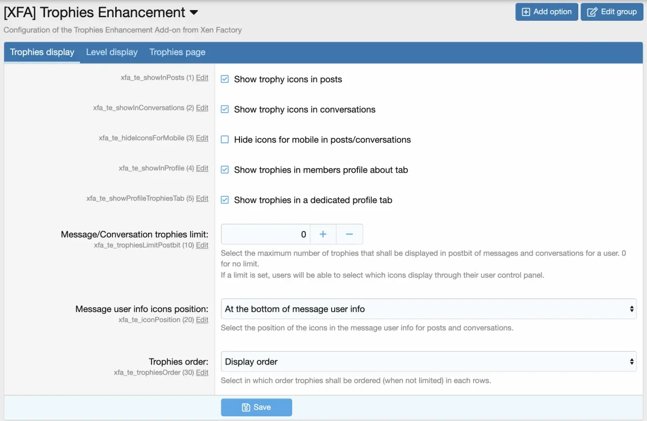 - Admin selection of displayed trophies in post and conversation messages from user edit page's trophies tab when limited