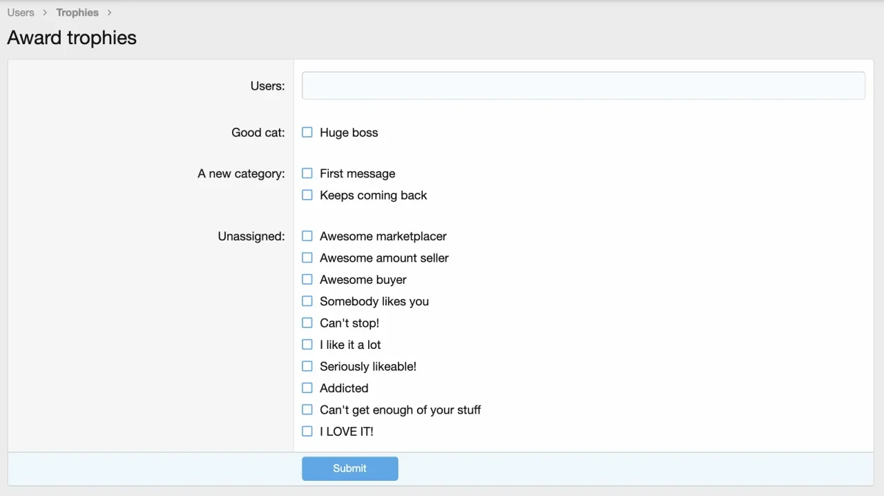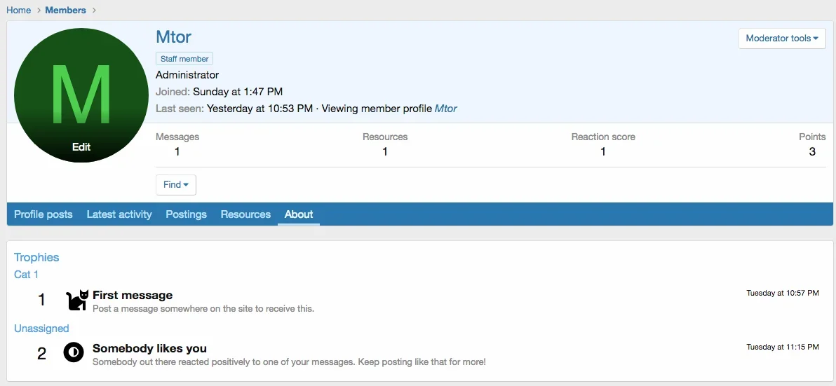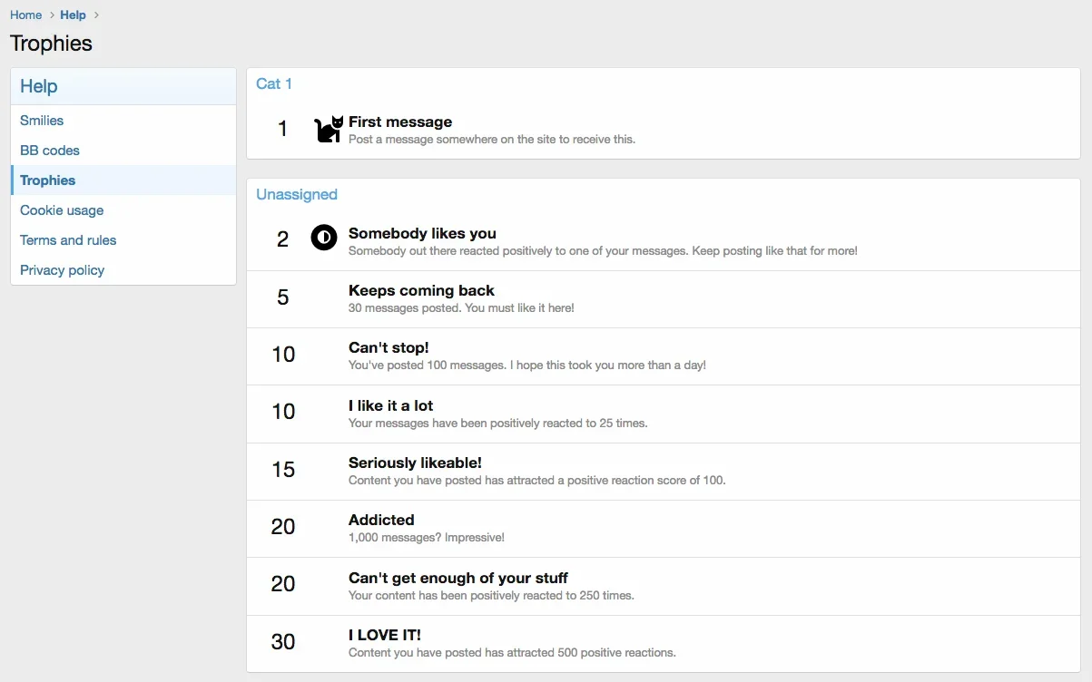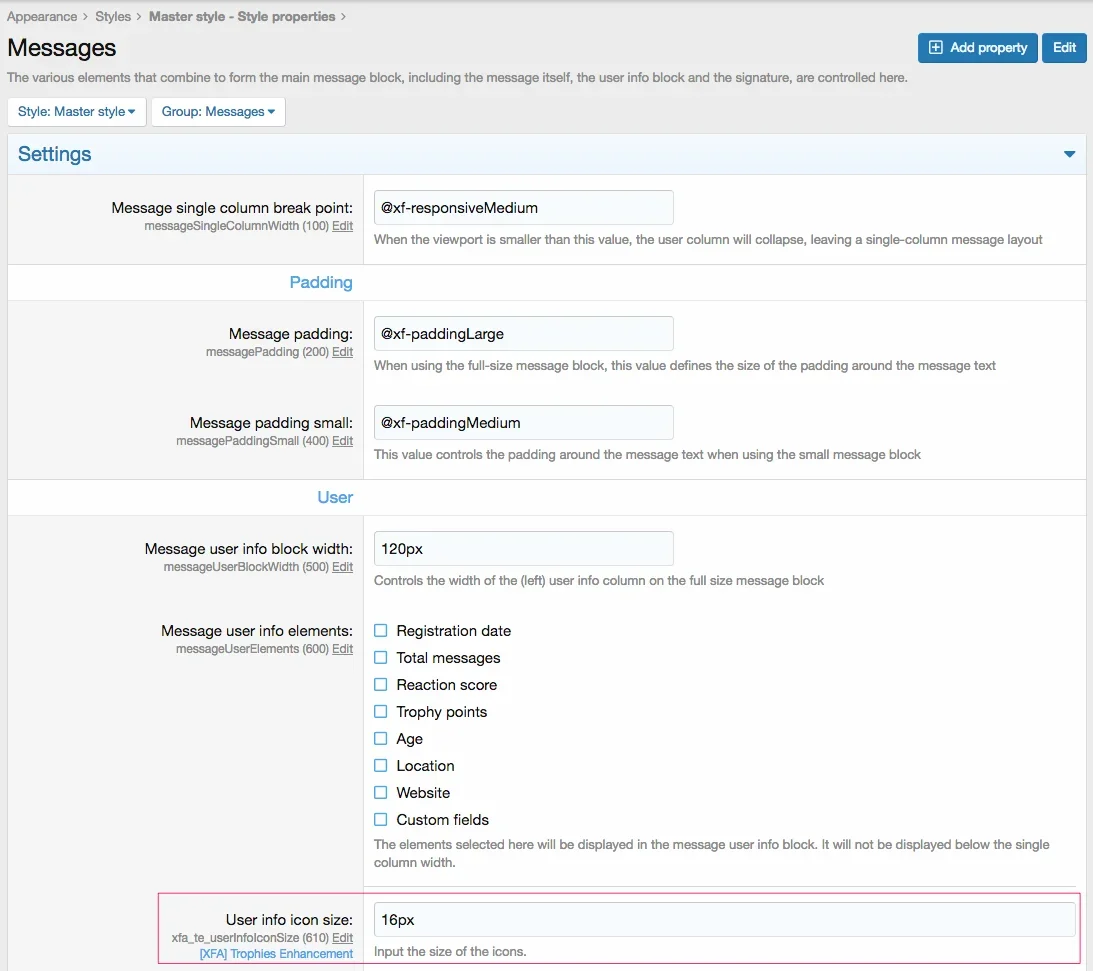 - Admin selection of displayed trophies in post and conversation messages from user edit page's trophies tab when limited