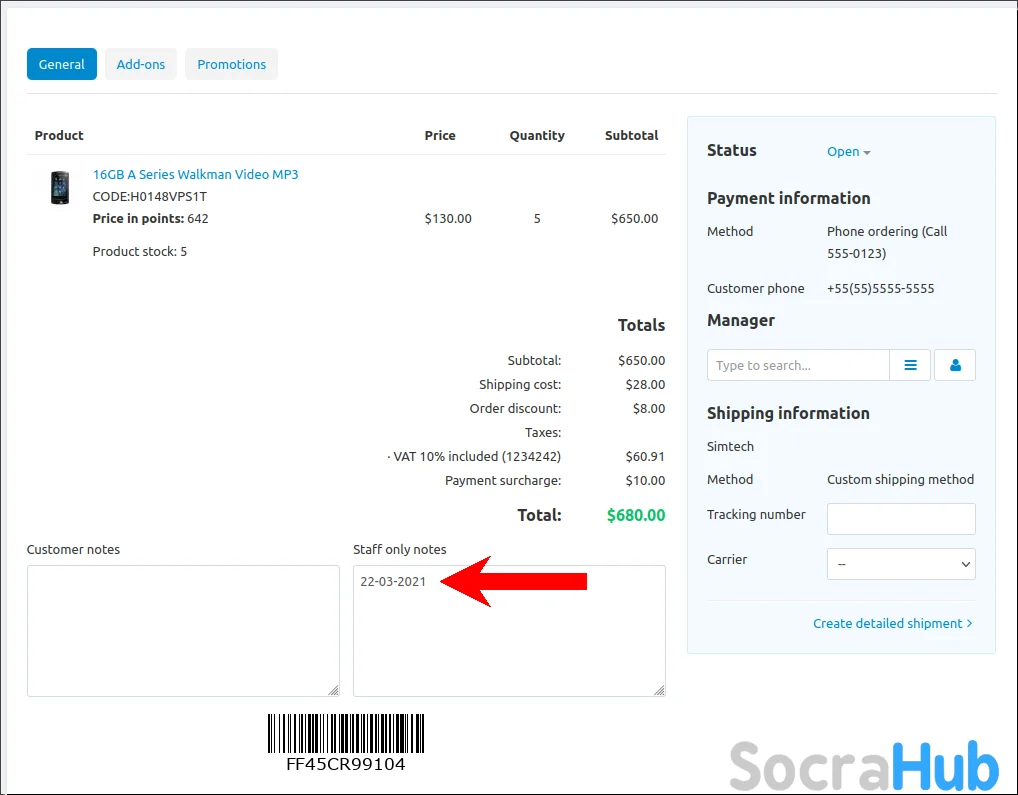 Add-on does not require any configuration - after installation, in orders advanced search a new field will appear, which searches for orders that contain given phrase in field "Staff only notes".